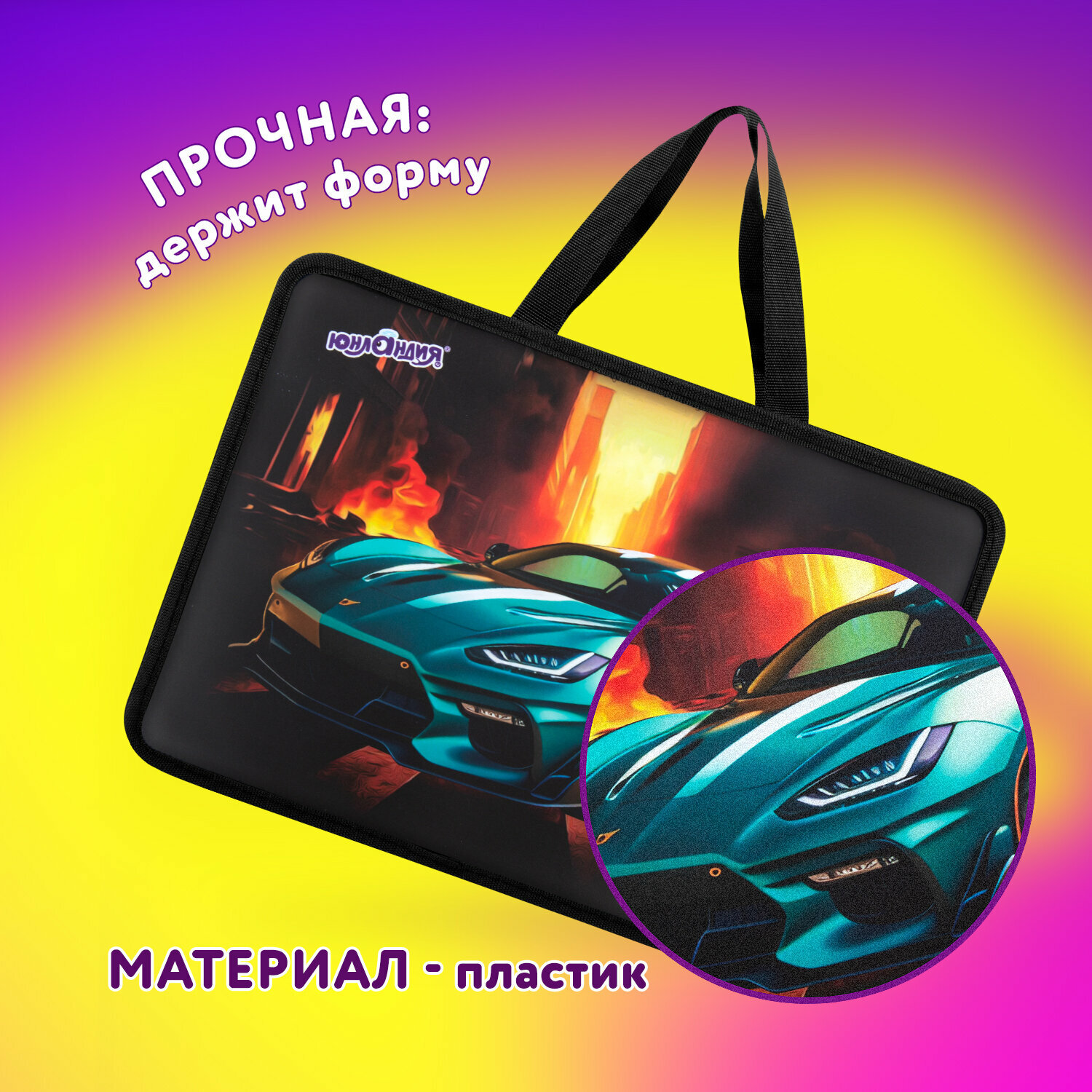 Папка с ручками А4 Юнландия "Neon car", пластик, на молнии (270118)
