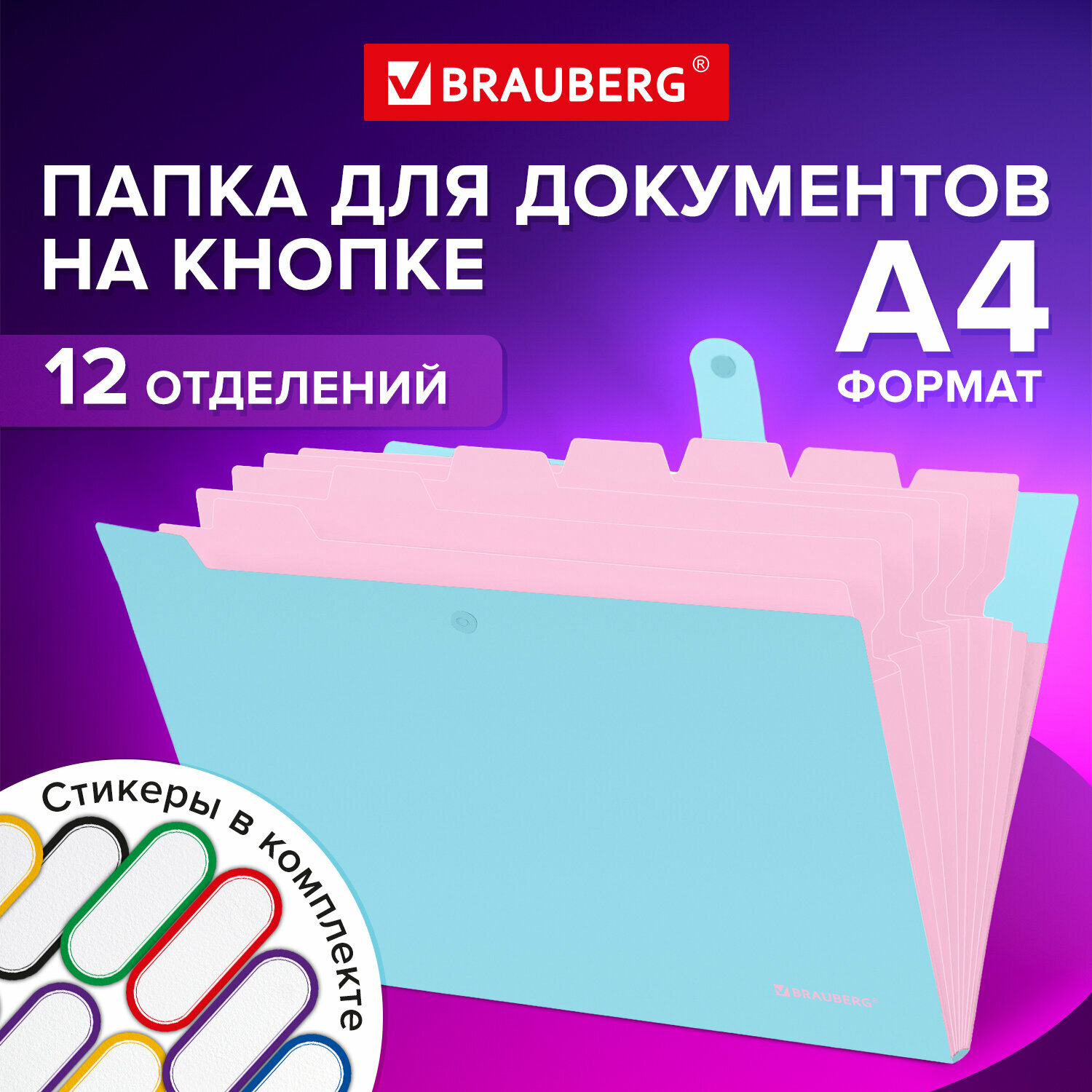 Купить Папка-органайзер на кнопке 12 отделений, Brauberg Extra, А4, голубая с розовым, 271932