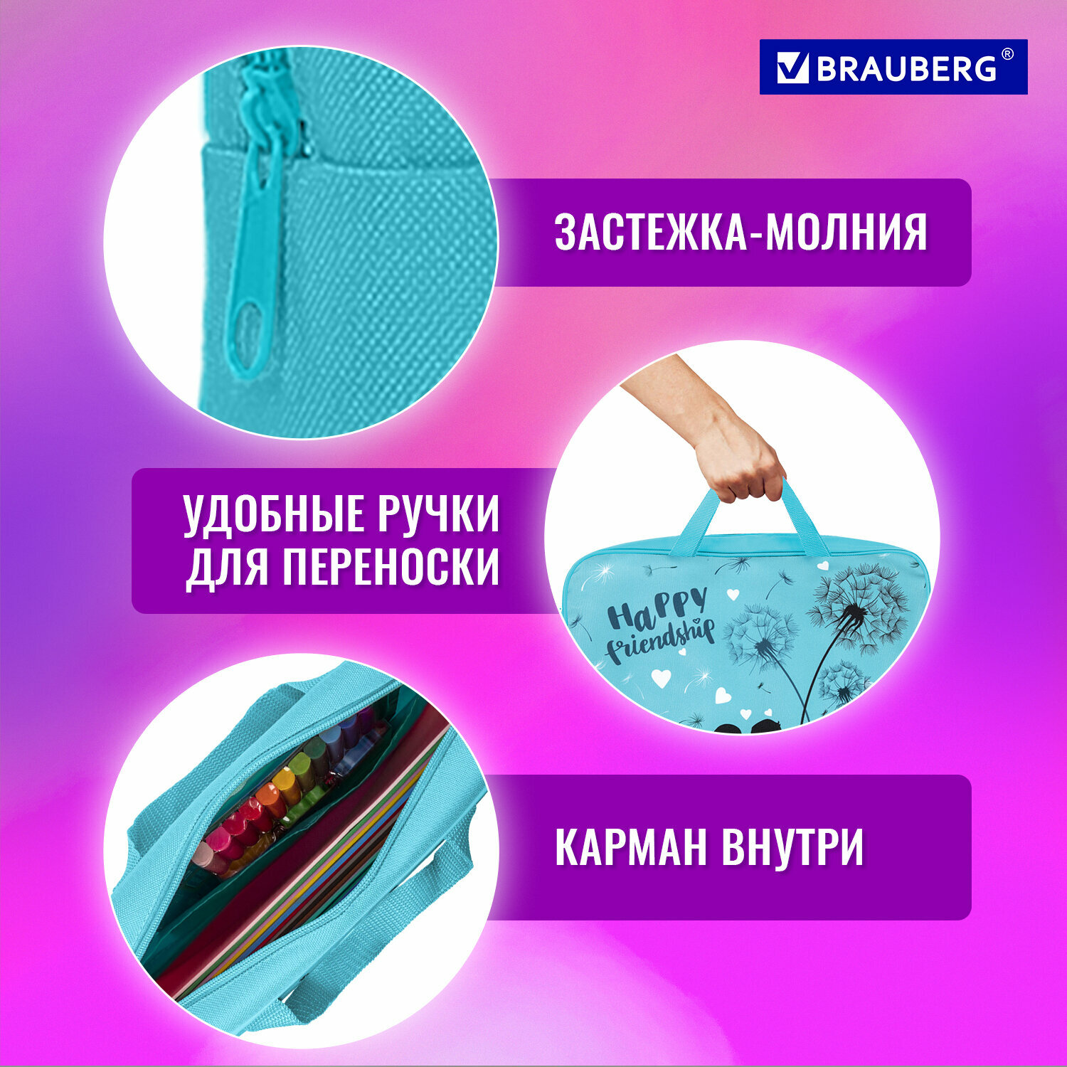 Папка на молнии с ручками BRAUBERG А4, 1 отделение, полиэстер, ширина 80 мм, "Happy friendship", 270958