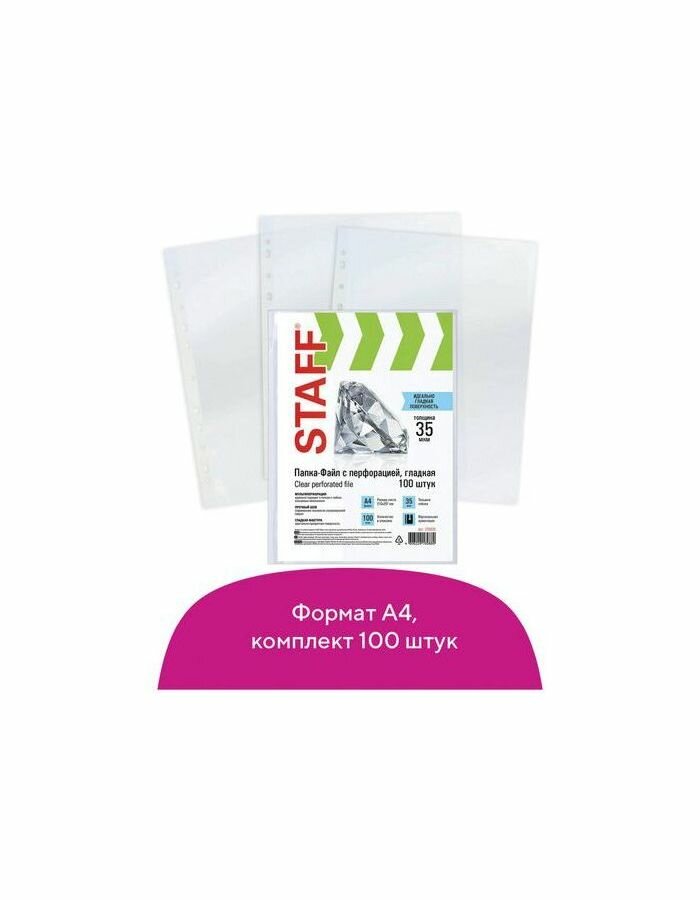Папки-файлы перфорированные А4 STAFF, комплект 100 шт., гладкие, 35 мкм, 226830 интересное: