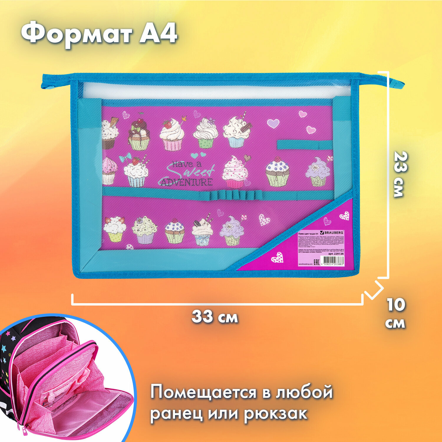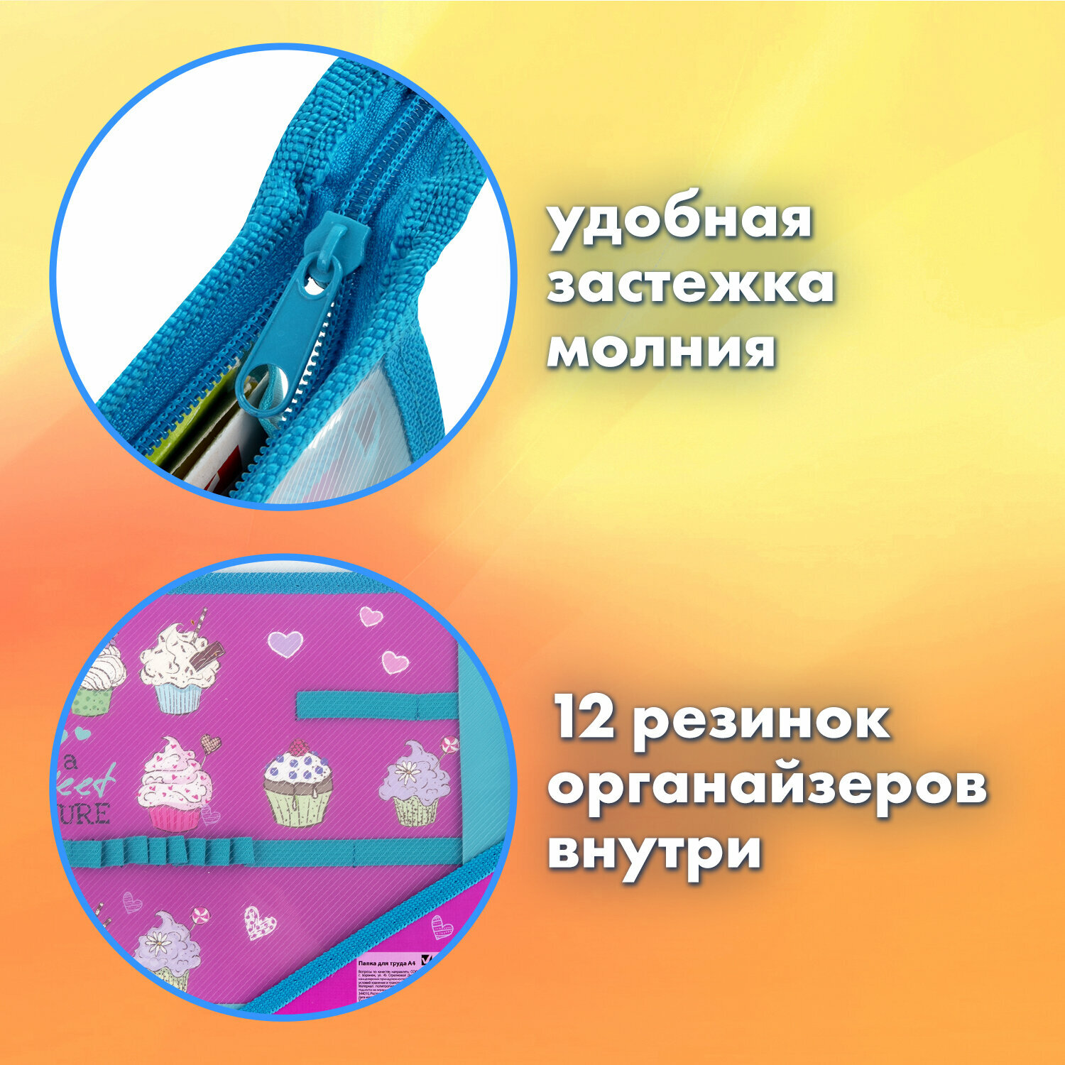 Папка для труда BRAUBERG А4, 2 отделения, пластик, молния сверху, органайзер, Cup Cakes, 229134 интересное: