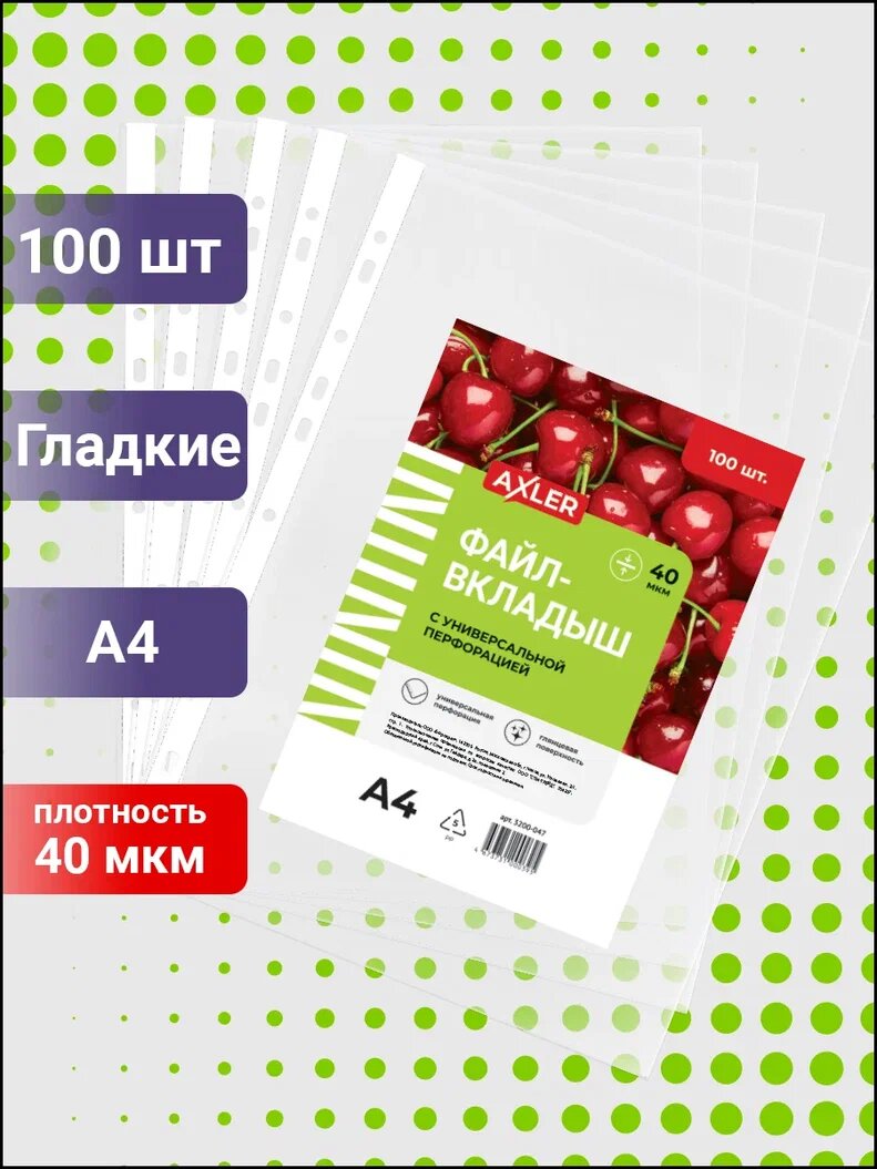 Купить Файлы а4 100 шт AXLER папка вкладыши с перфорацией, прозрачные гладкие глянцевые мультифоры для документов, файлики формата a4 плотные 40 мкм в наборе