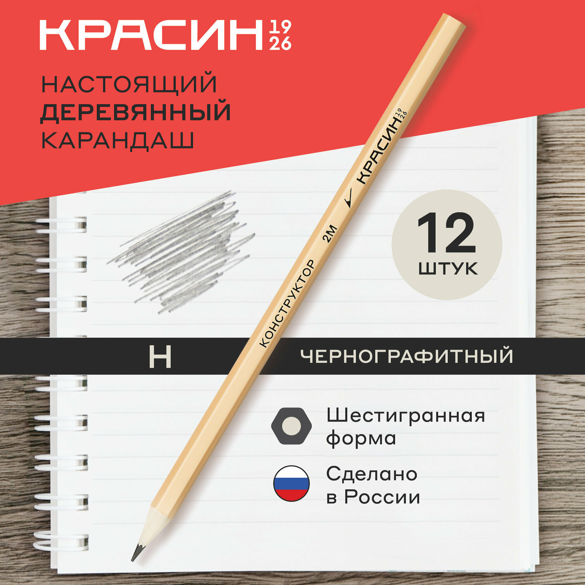 Купить Карандаш простой для школы "H" / Набор простых карандашей для рисования и офиса из 12 штук Красин "Конструктор" / чернографитные карандаши