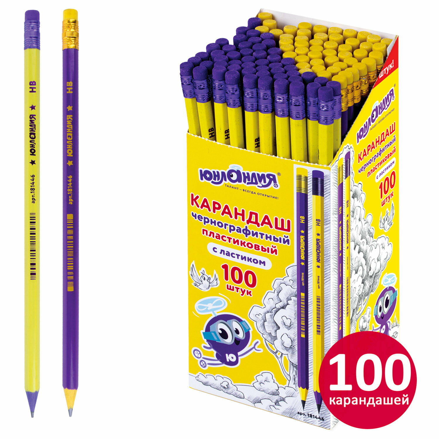 Карандаш чернографитный с ластиком юнландия, НВ, комплект 100 штук, корпус ассорти, 880434 интересное: