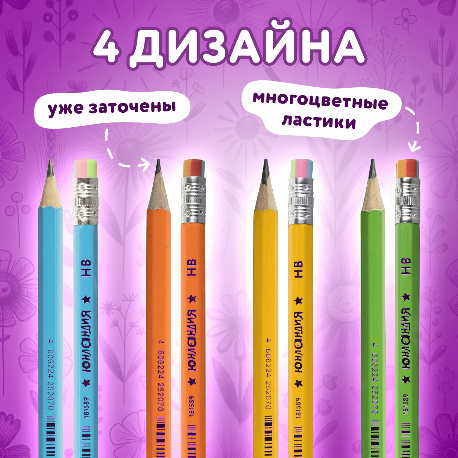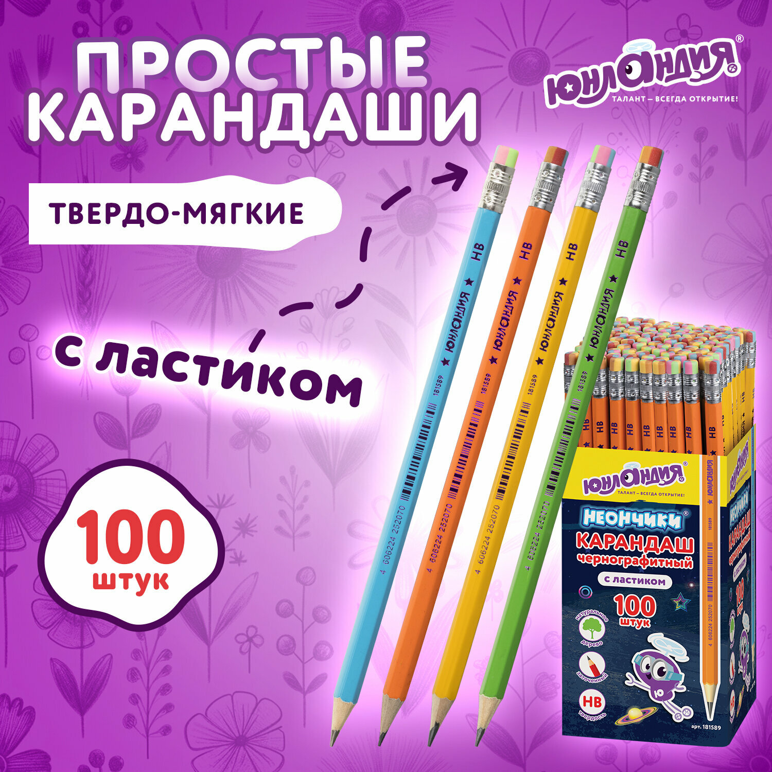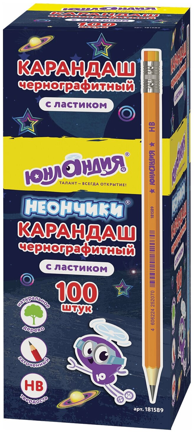 Карандаш чернографитный с ластиком юнландия неончики, НВ, комплект 100 штук, корпус ассорти, 880436 интересное: