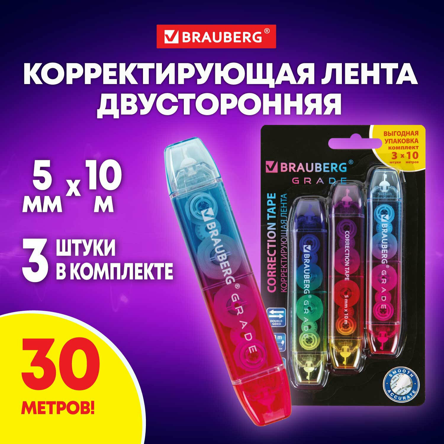 Купить Корректирующая лента Brauberg двусторонняя, 0,005x10 м, комплект 3 штуки, grade, блистер