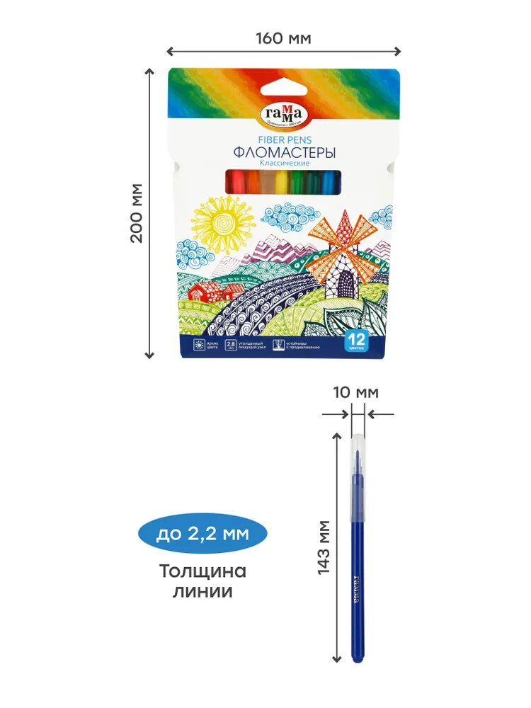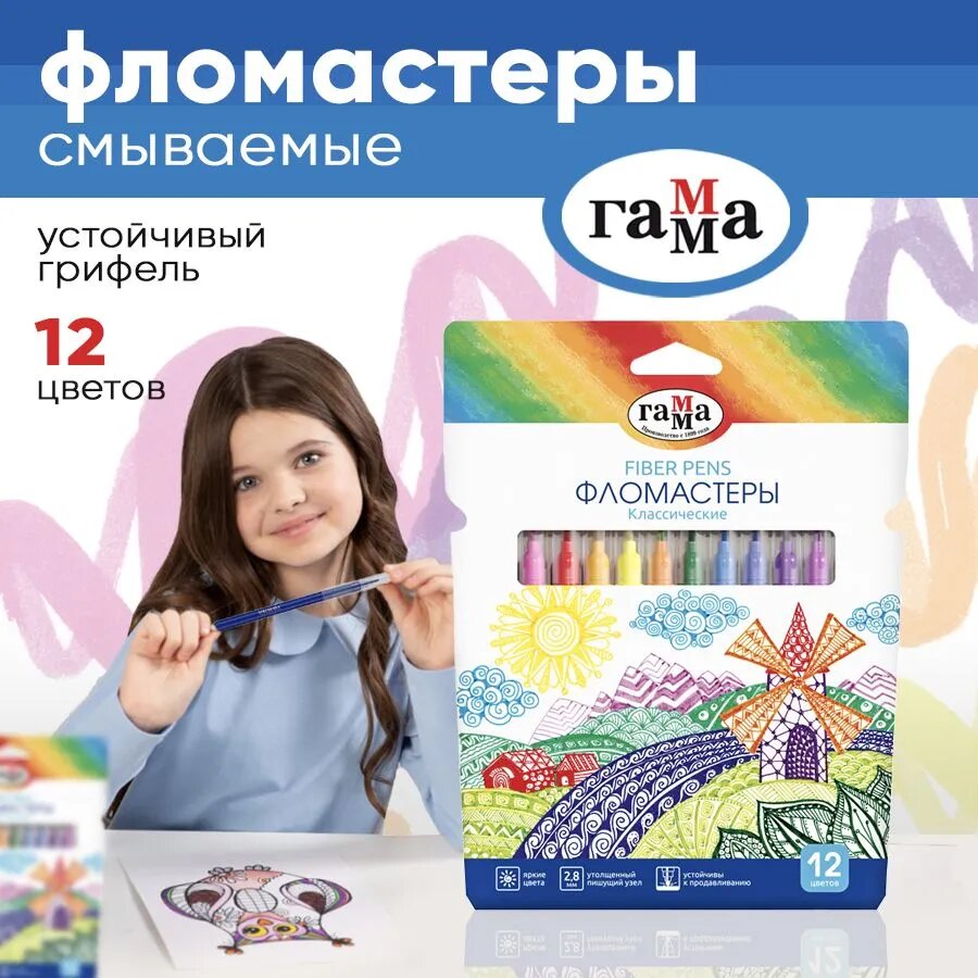 Купить Фломастеры для рисования Гамма "Классические" / набор 12 цветов, смываемые, детские, для малышей, для школы