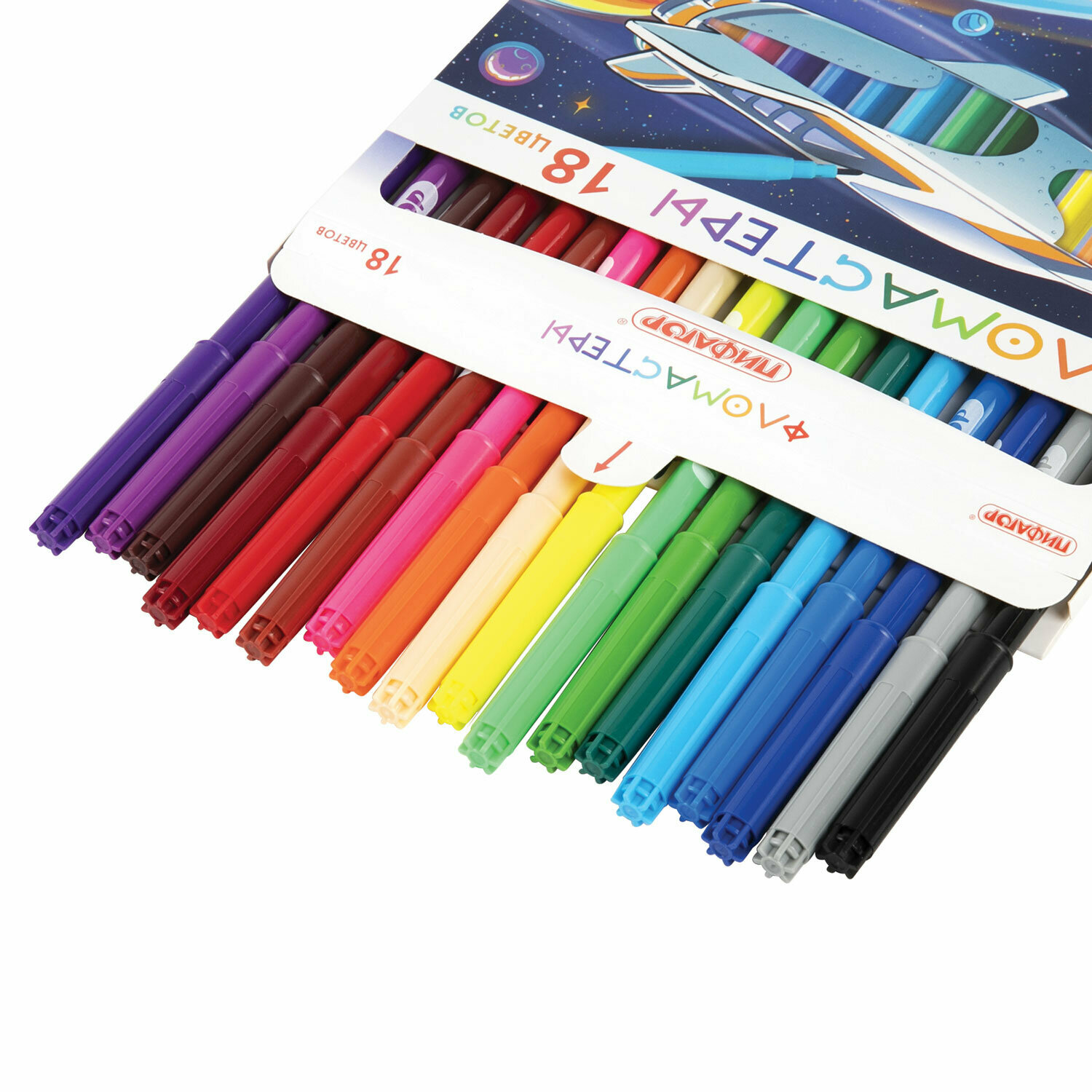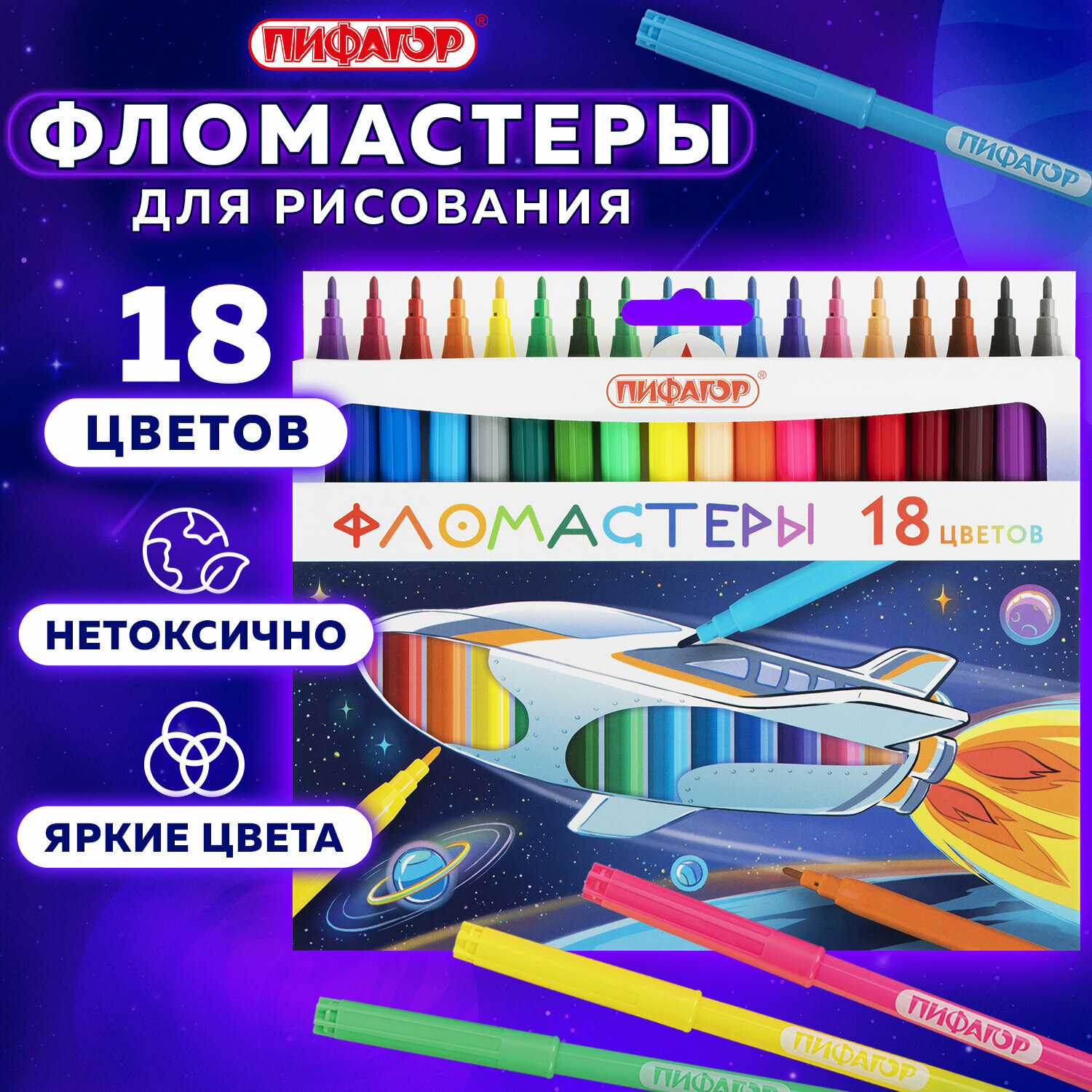 Купить Фломастеры для рисования для детей Космическая одиссея, набор 18 цветов, вентилируемый колпачок, Пифагор, 152445