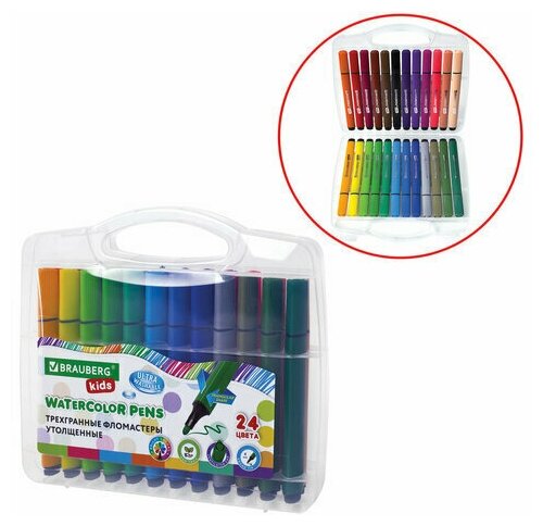 Фломастеры в пластиковом кейсе трехгранные утолщенные Ультрасмываемые, Brauberg Kids, 24 цвета, 1521 .
