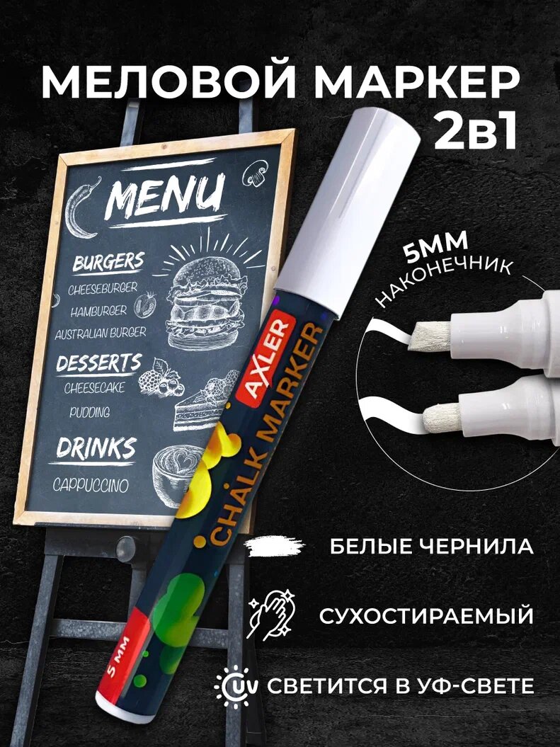 Купить Меловой маркер AXLER, белый стираемый на водной основе, фломастер жидкий мел для ценников доски стекла металла и других гладких поверхностей, 5 мм