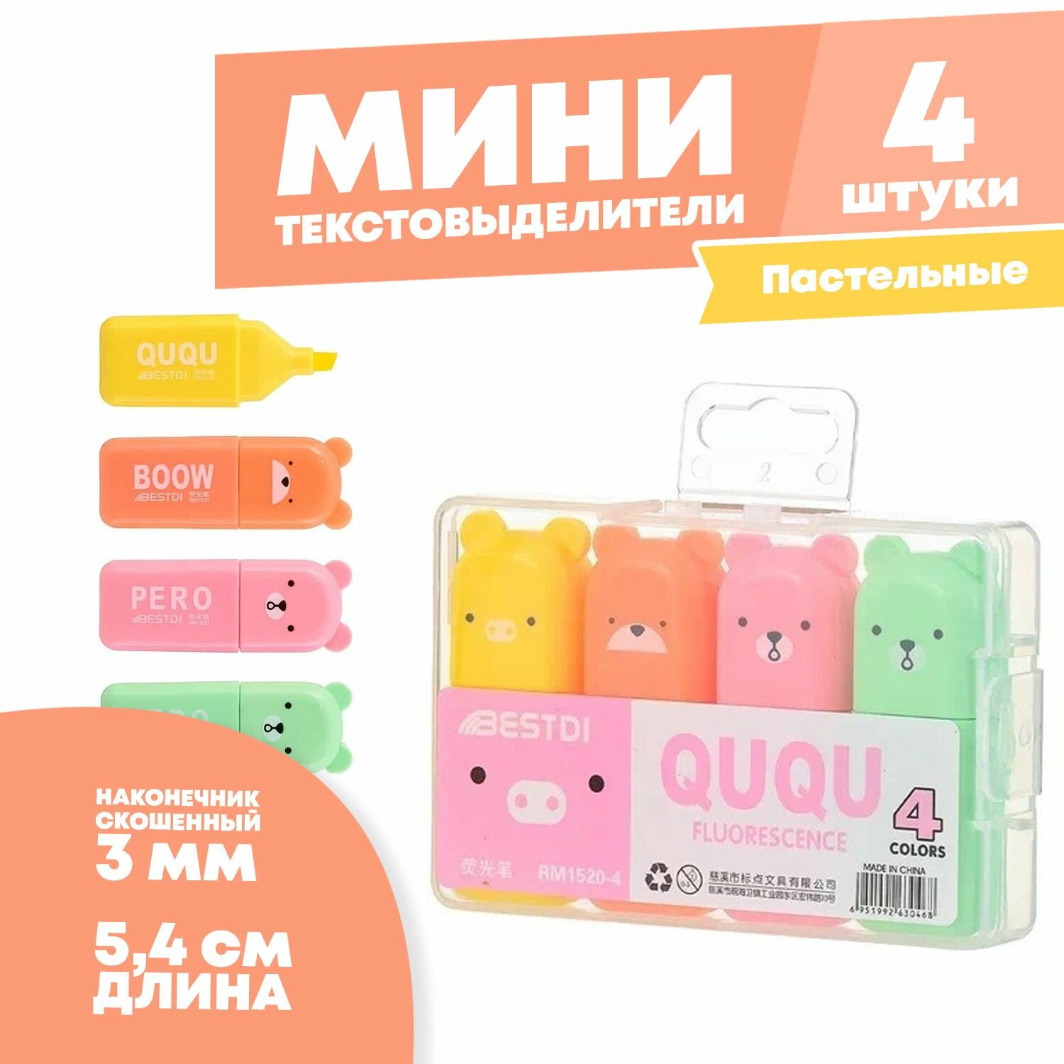 СохранитьНабор мини текстовыделителей, 4 шт, четырех цветов, серия "Мишка", текстмаркеры детские длиной 5.4 см, фломастеры хайлайтеры MC-Basir, 4 цвета интересное: