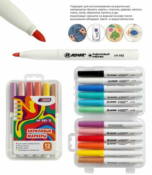 Маркеры акриловые для рисования ASMAR, пулевидный наконечник, 12 цветов, для любых поверхностей интересное: