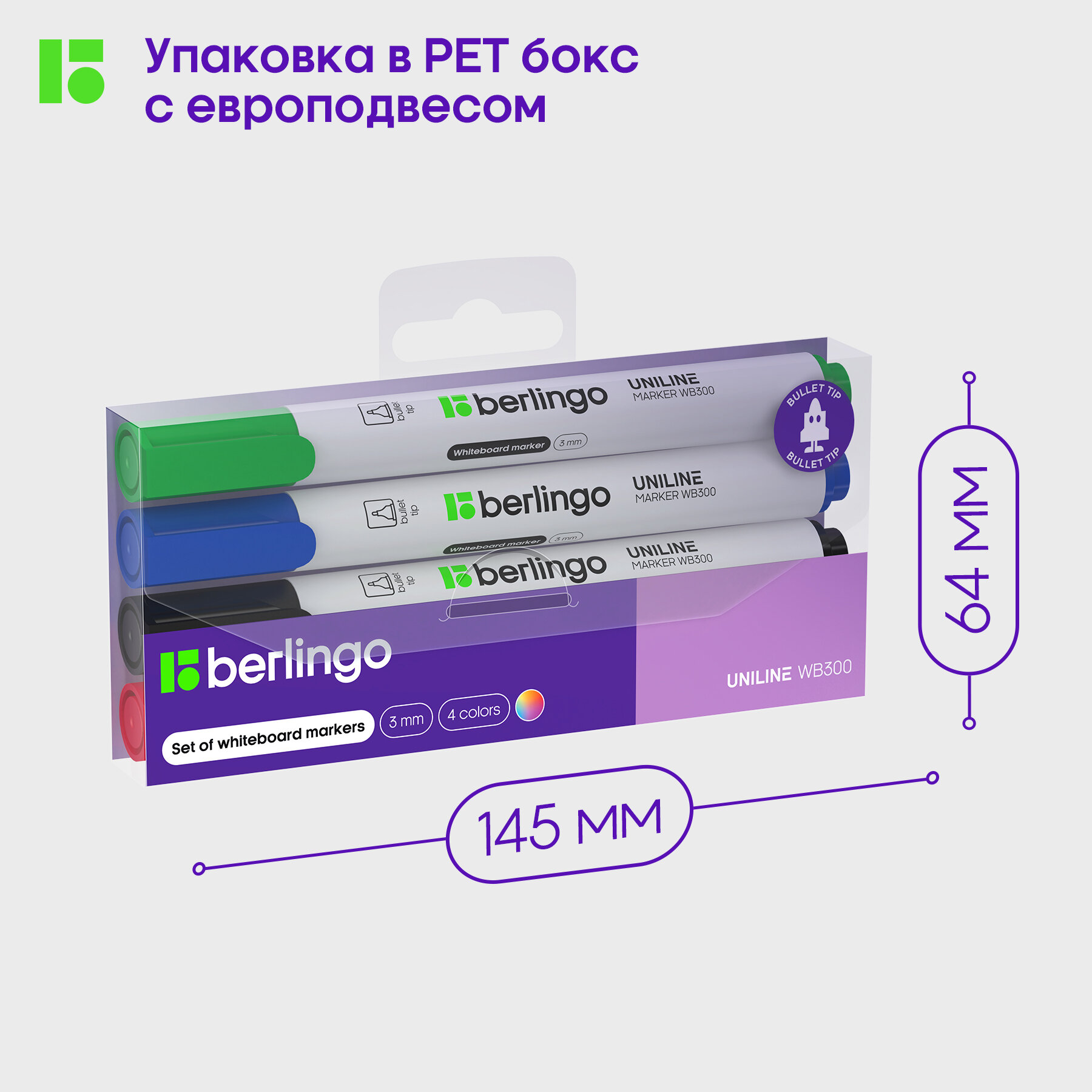 Набор 4 шт. - Маркер для белых досок Berlingo "Uniline WB300", зеленый, пулевидный наконечник, 3 мм PM6411