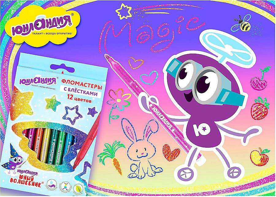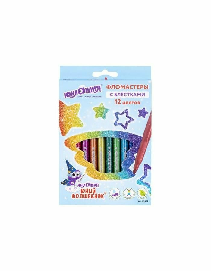 Купить Фломастеры с блестками для рисования для детей набор Юнландия 12 цветов, Юный Волшебник, ударопрочный наконечник, вентилируемый колпачок, картон