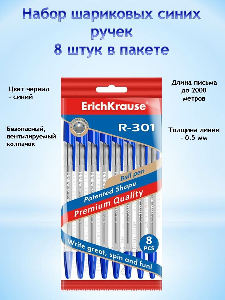 Набор из 8 ручек шариковых ErichKrause R-301 Stick Original 1.0, цвет чернил синий (в пакете)