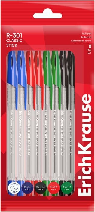 Набор из 8 ручек шариковых ErichKrause R-301 Stick Classic 1.0, цвет чернил: синий, черный, красный, зеленый