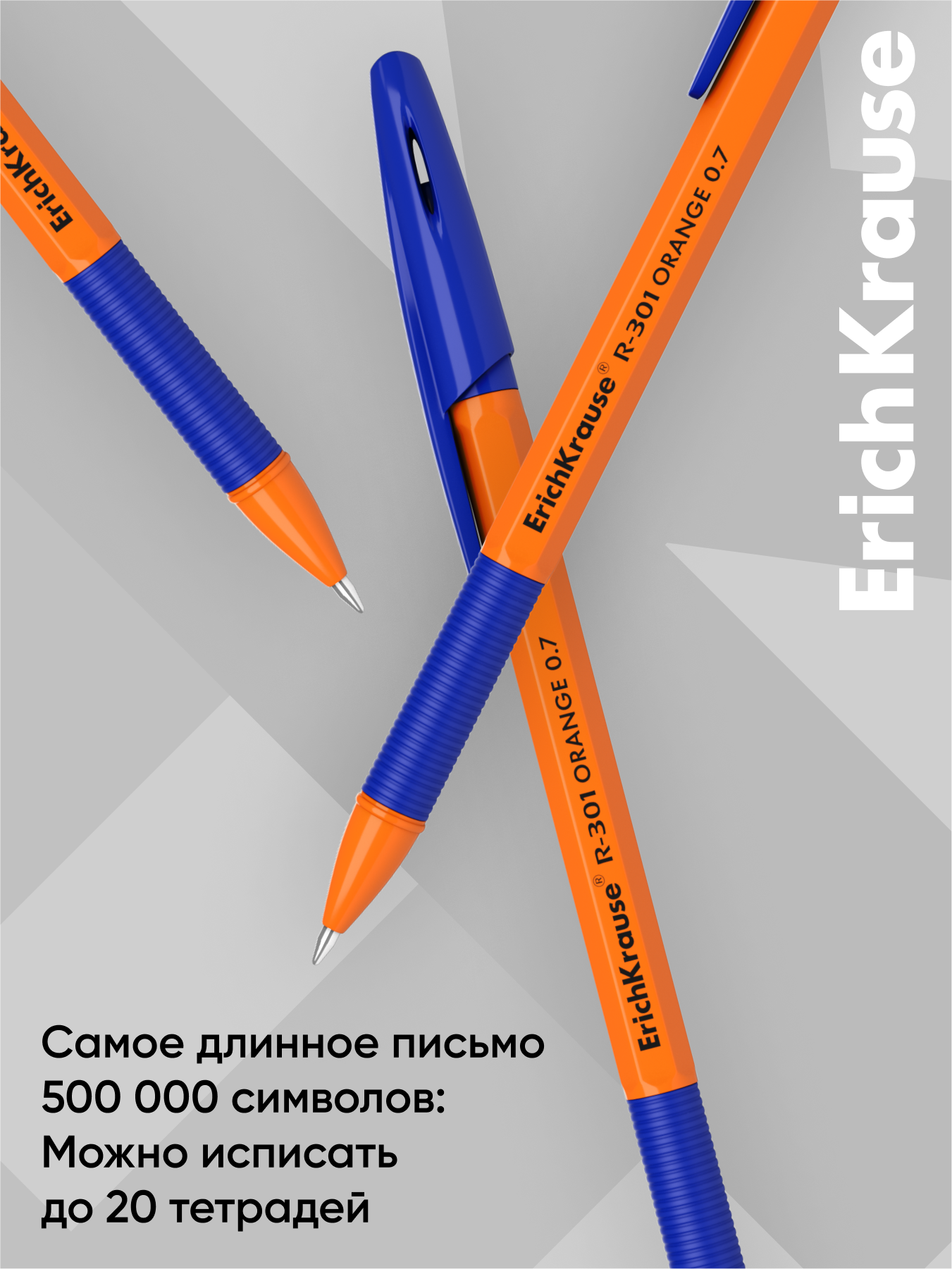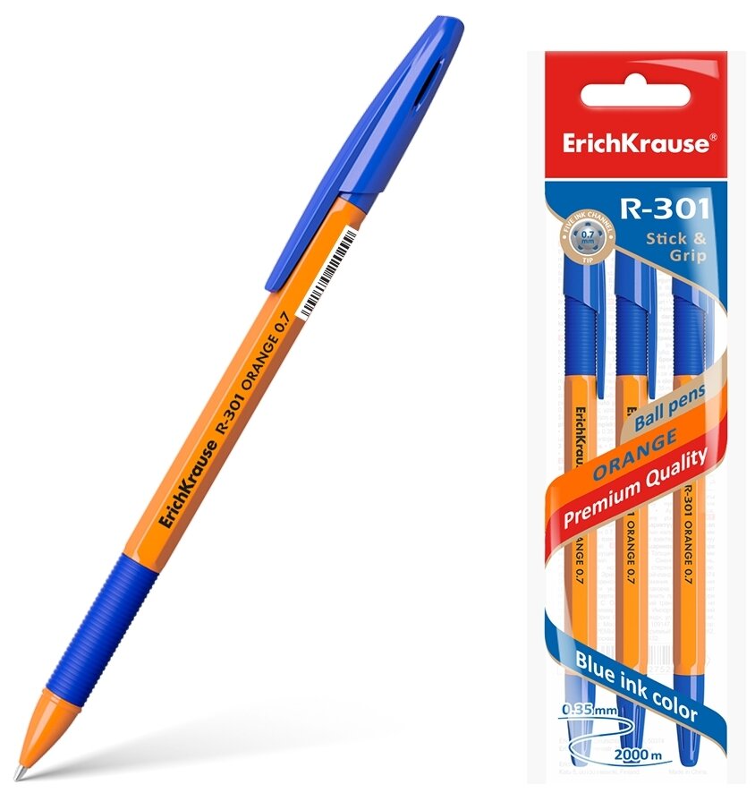 Купить Ручка шариковая ErichKrause® R-301 Orange Stick&Grip 0.7, цвет чернил синий (в пакете по 3 шт.)