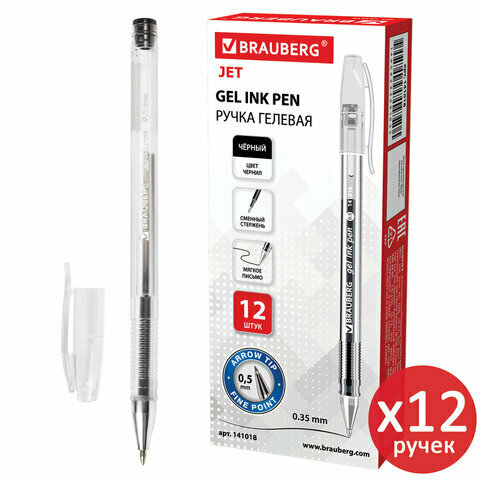 Ручка гелевая BRAUBERG Jet, комплект 12 штук, черная, узел 0,5мм, линия письма 0,35мм, 880208 интересное: