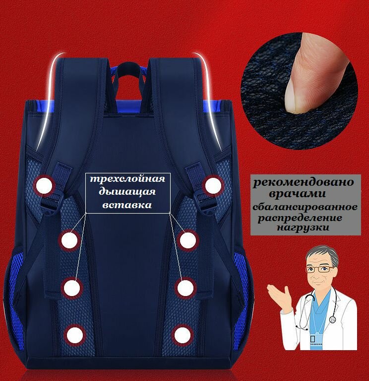 | Особенности | водоотталкивающая пропитка / ортопедический / светоотражающие элементы / эргономичная спинка |