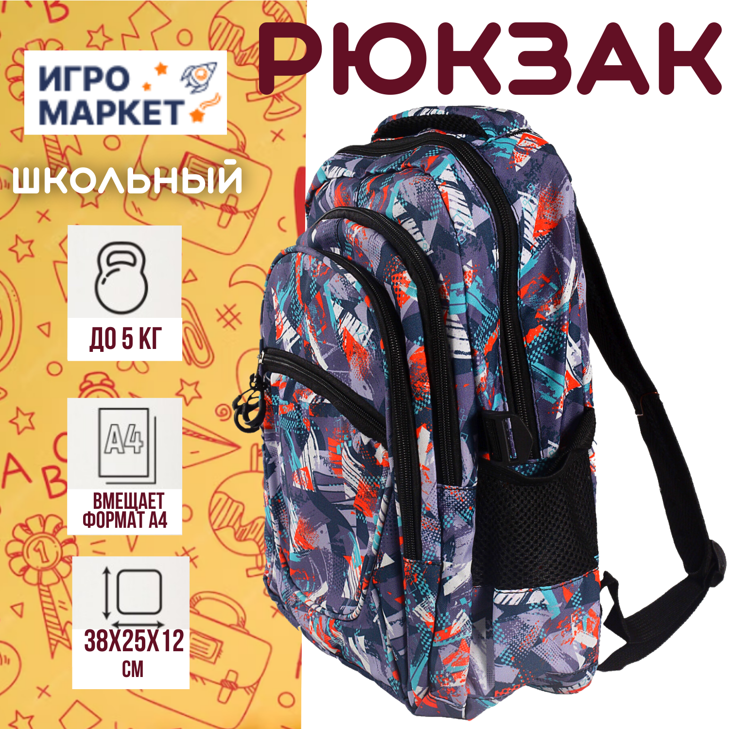 Купить Рюкзак ранец портфель "Мазки краски" 38х25х12 см школьный 2 отдела, 2 фронтальных кармана, боковые карманы на резинке, для мальчика, для девочки, широкие лямки, эргономичная спинка – сетка, цвет яркий / 1 шт