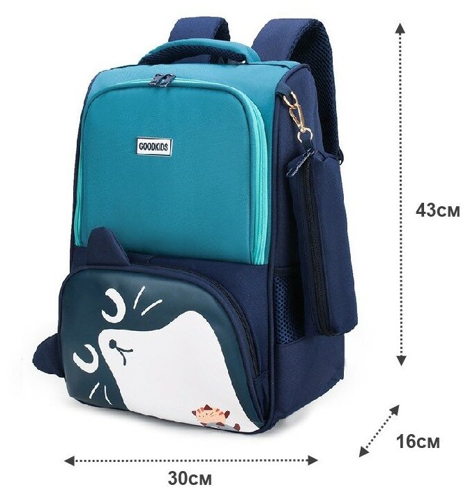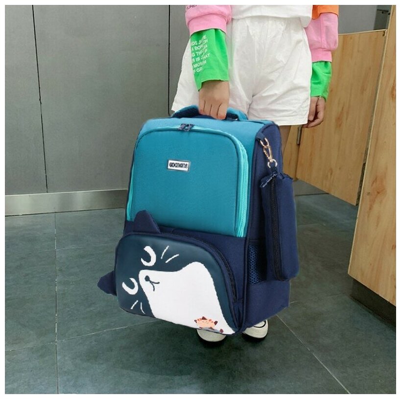 Рюкзак ранец школьный для девочки с анатомической спинкой Котик Goodkids синий, с пеналом