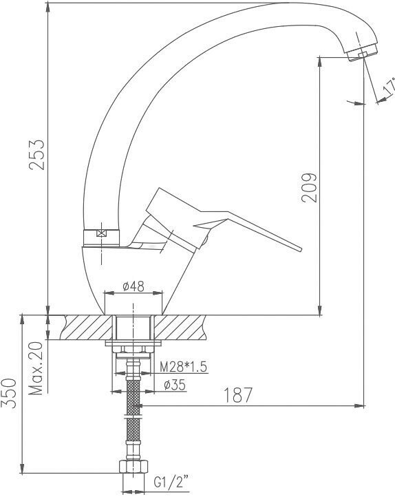 Haiba Смеситель для кухни (Lt) трубчатый поворотный излив, картридж 40 мм, гайка, хром, HB4163-2