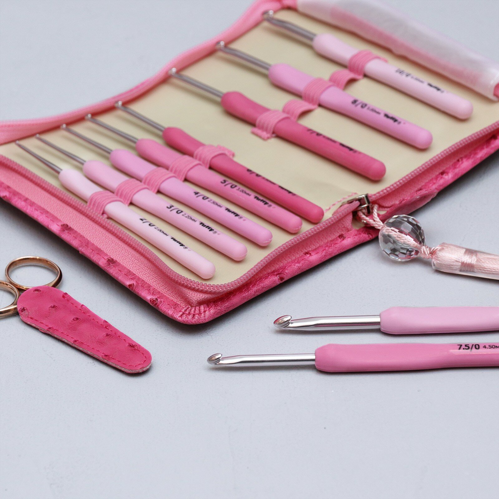 | Дополнительная информация | Tulip - это марка, которая заботится о своих покупателях и старается сделать вязание наиболее комфортным. Крючки являются визитной карточкой этой японской фабрики. Это изделия гарантированно высокого качества. Форма ручки является наиболее удобной для комфортной работы, подходит для любого захвата. Специально обработанный наконечник крючка, позволяет скользить нити легко и свободно. Крючки выполнены в розовом цвете. Оттенок ручек разный в зависимости от размера. Очень милые и яркие! Все инструменты хранятся в розовом футляре из кожи страуса (имитация). Футляр закрывается на молнию, которую украшает шелковая кисть с большой хрустальной бусиной. |