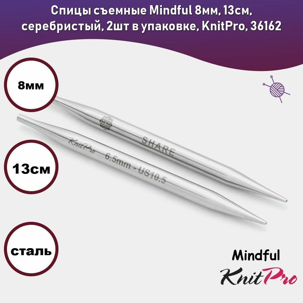 Купить Спицы съемные Mindful 8мм/13см, нержавеющая сталь, серебристый, 2шт в упаковке, KnitPro, 36162