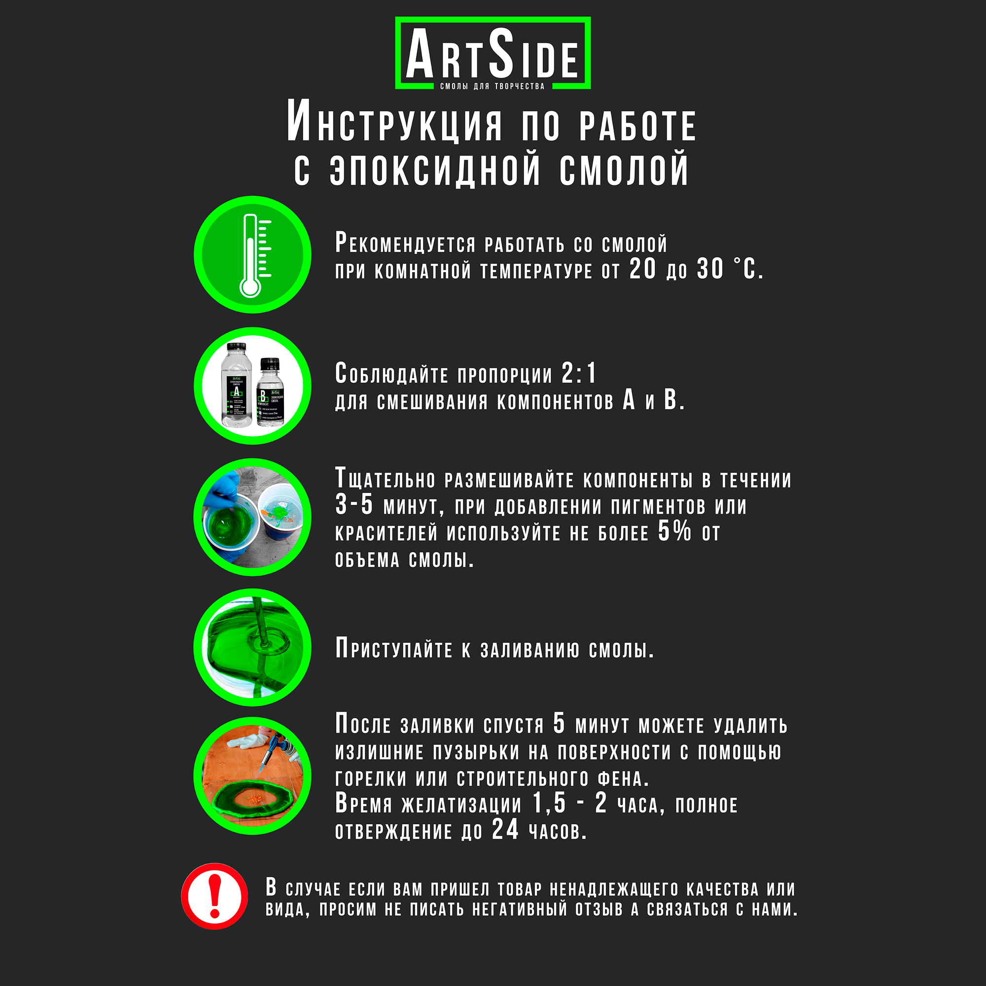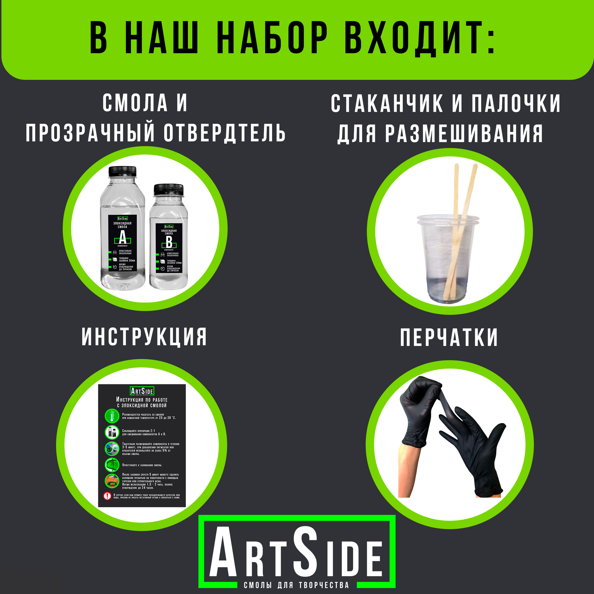 | Комплектация | Смола 1шт, отвердитель 1шт, стаканчик 1шт, палочки 2шт, перчатки 2шту, инструкция 1шт. |