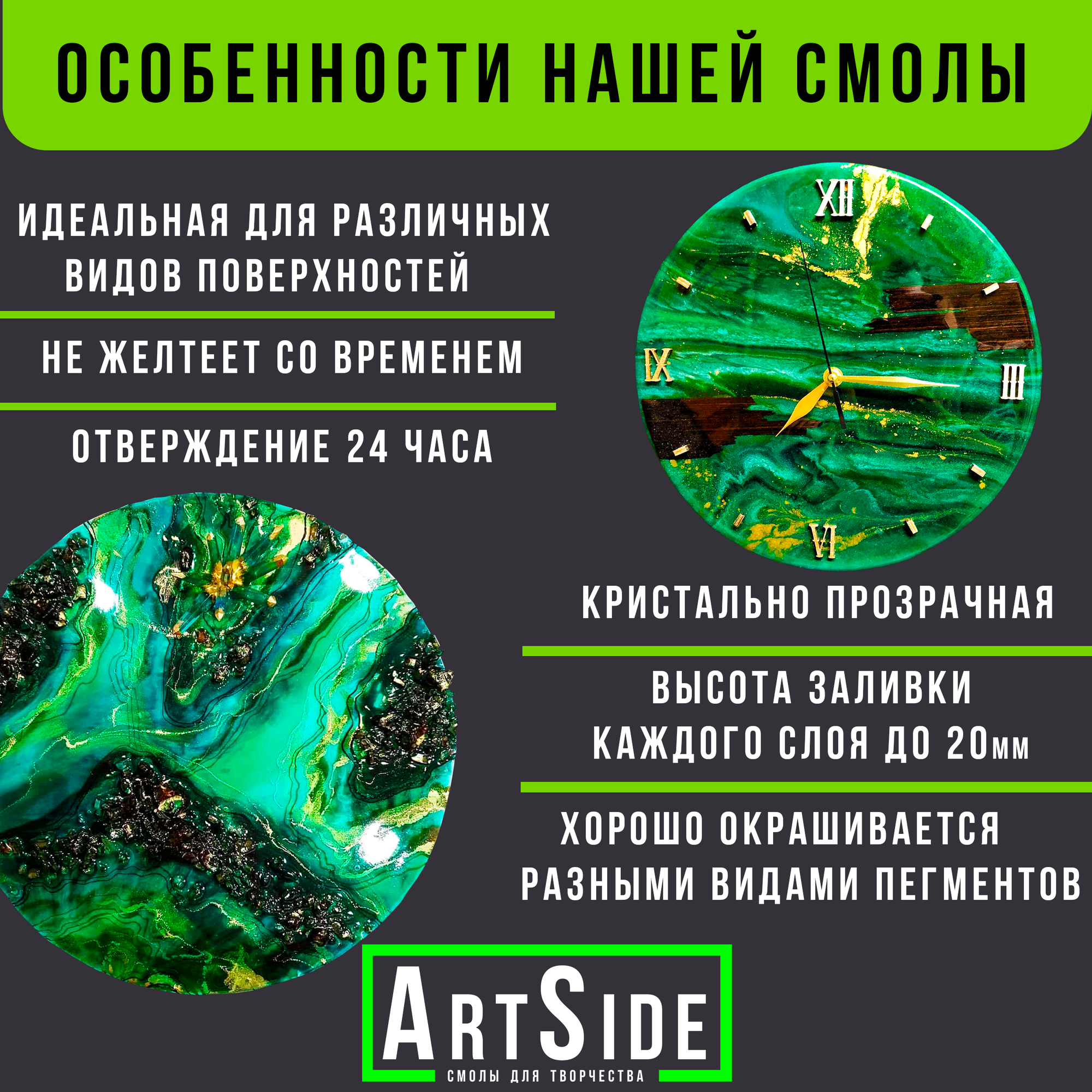 | Дополнительная информация | Эпоксидная смола Art Side используется для для создания картин и рисунков в технике Resin Art, заливки в формы и молды, для изготовления бижутерии, различная мебель (столы, стулья и т.д.) |