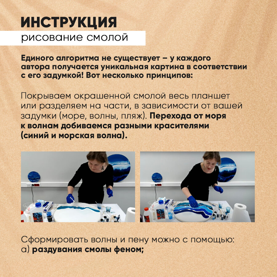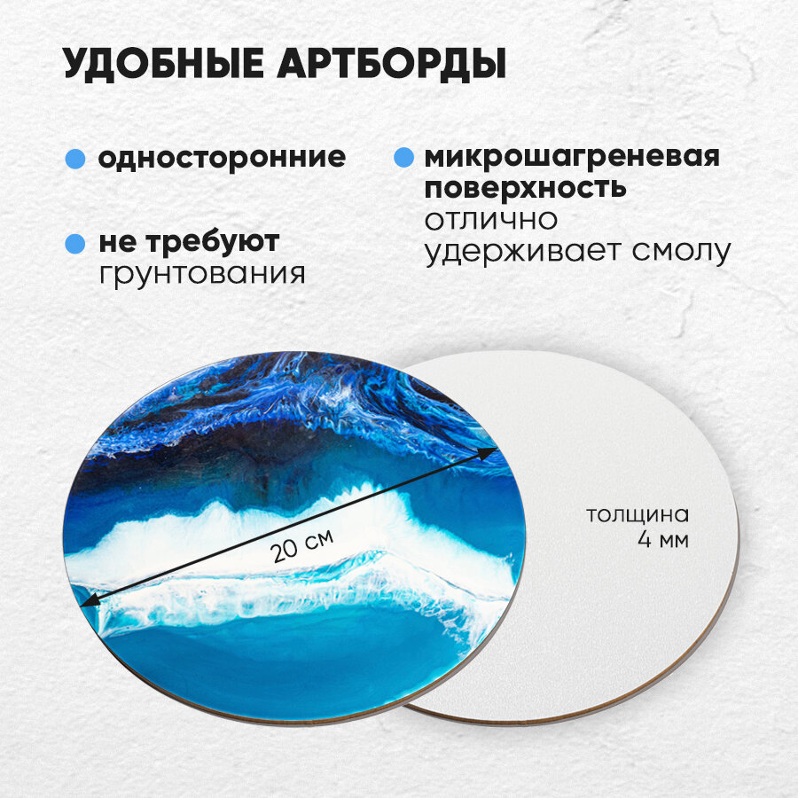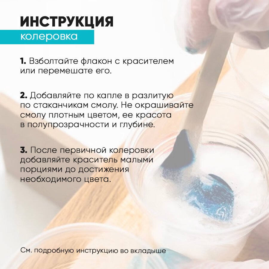 | Комплектация | Смола (200 г) + отвердитель (100 г) Артборд односторонний, круглый, диаметр 20 см - 2 шт Красители (15 г) - 4 шт Глиттер лазурь 3 мл Стаканчики 250 мл - 2 шт. Стаканчики 30 мл - 5 шт. Палочки для смешивания - 5 шт. Перчатки для работы со смолой - 1 пара Защитный фартук для работы - 1 шт. Инструкция - 1 шт. |