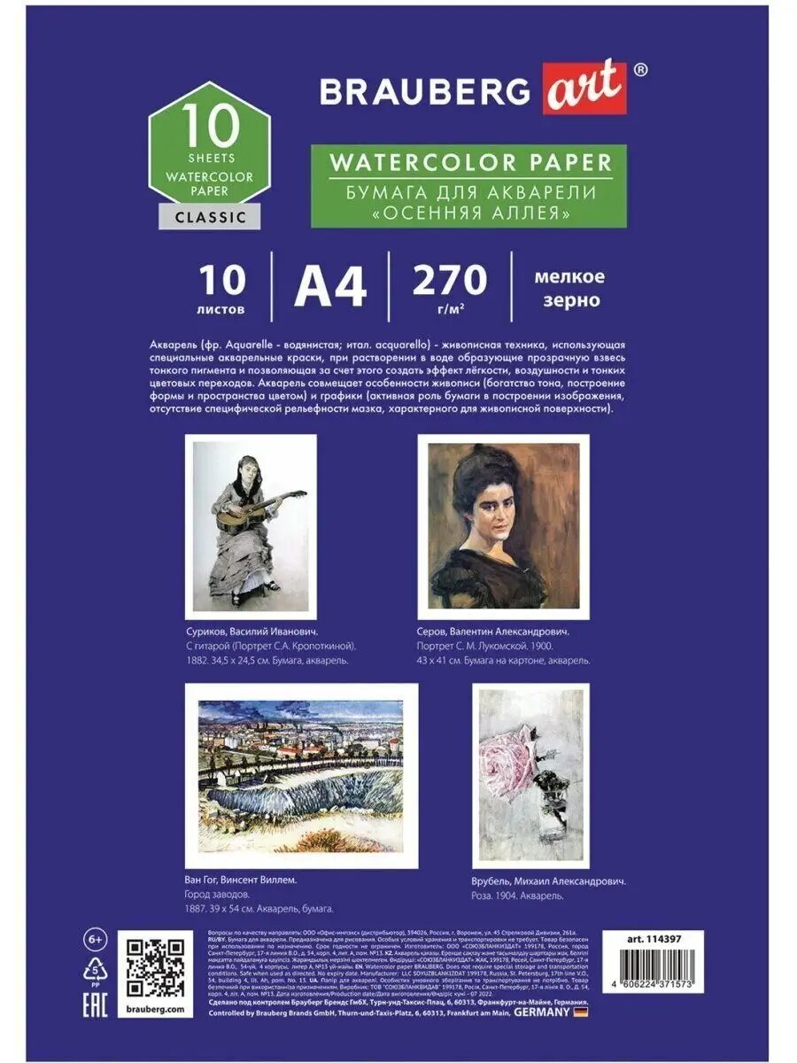 Бумага для акварели А4, 30л Brauberg Art Classic "Девушка" (270 г/кв.м, мелкое зерно) (114401), 10шт.