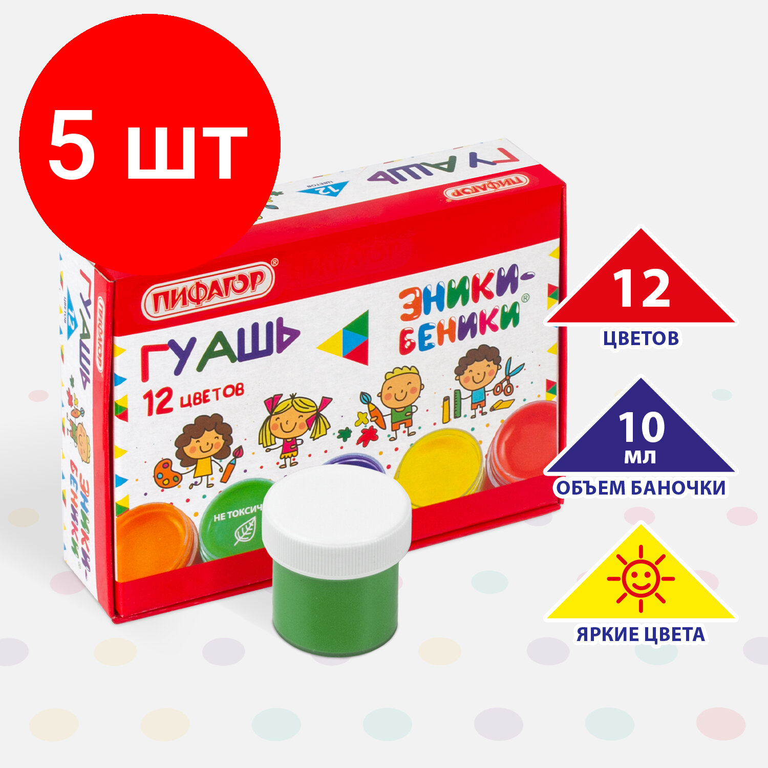 Купить Комплект 5 шт, Гуашь пифагор "эники-беники", 12 цветов по 10 мл, без кисти, картонная упаковка, 191330