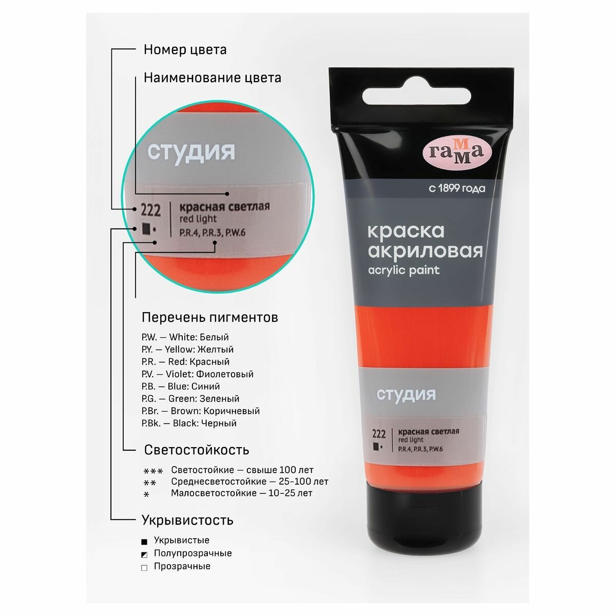Краска акриловая художественная Гамма "Студия", пластиковая туба, 110мл, красная светлая (2802110222)