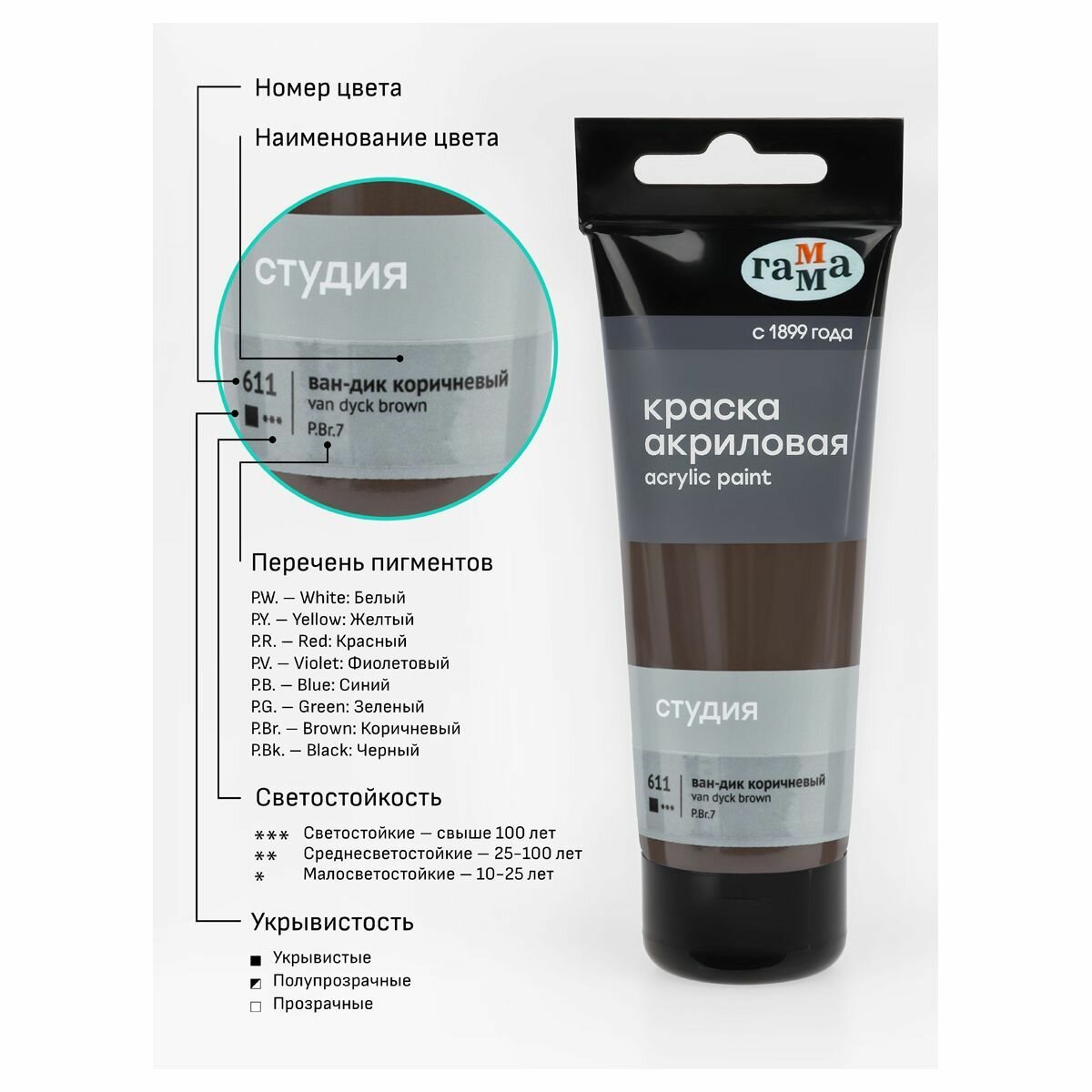 Сохранить6 шт - Краска акриловая художественная Гамма "Студия", 75мл, пластиковая туба, ван-дик коричневый интересное: