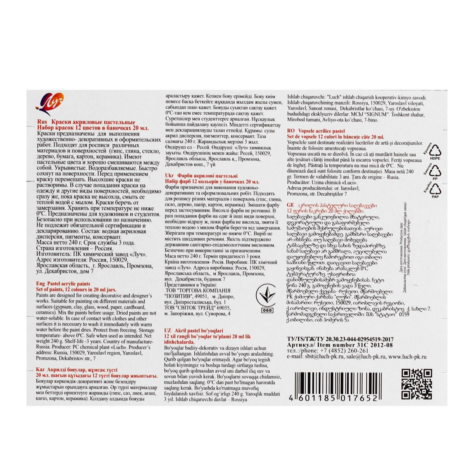 Акрил набор / Краски акриловые пастельные 12 цветов / Луч / Краски для рисования/пастельные глянцевые Акриловые 12 цветов/Пастельные интересное: