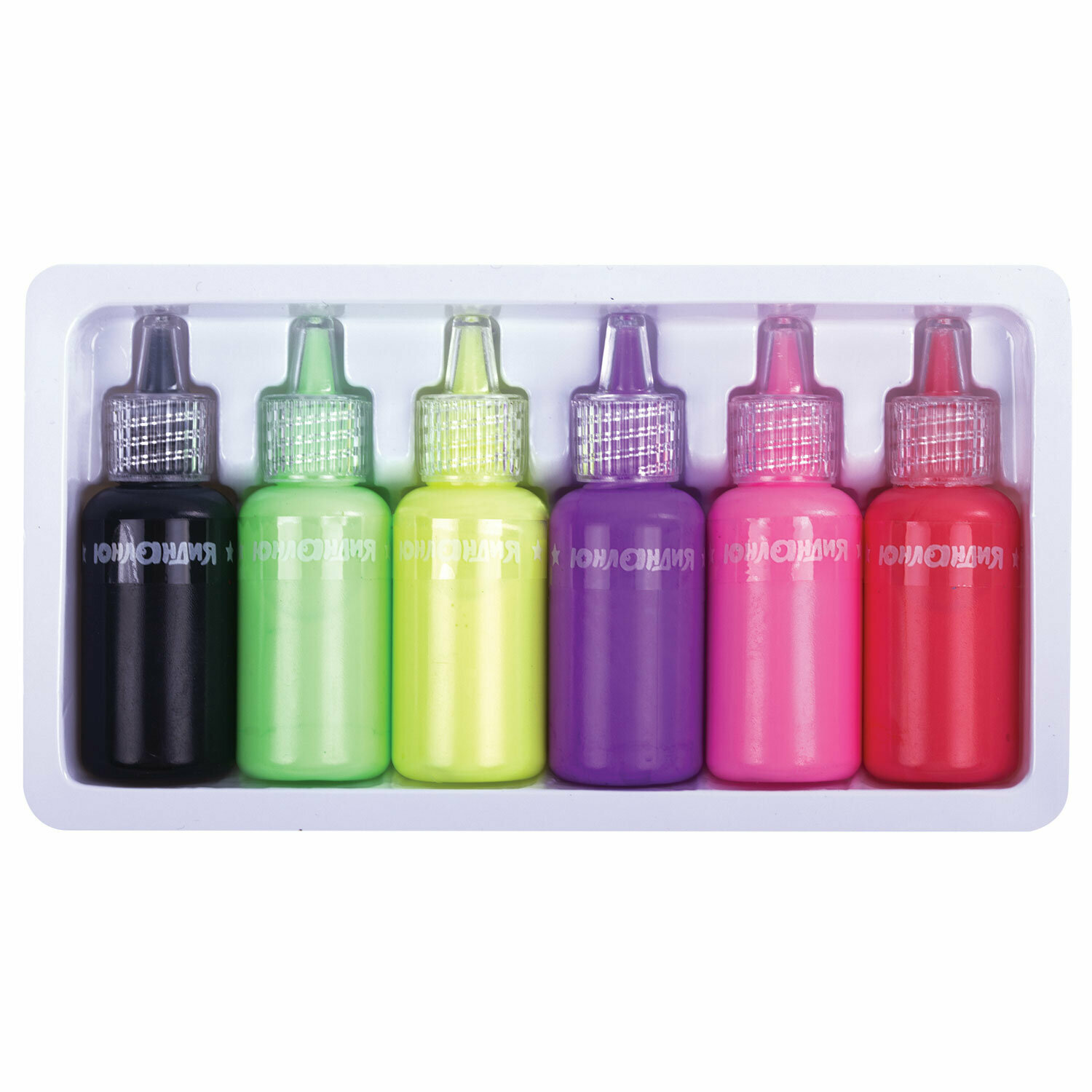 Купить Витражные краски по стеклу Юнландия Неончики, 5 цветов светящихся в темноте + 1 черный, 20 мл, шаблоны, 191760