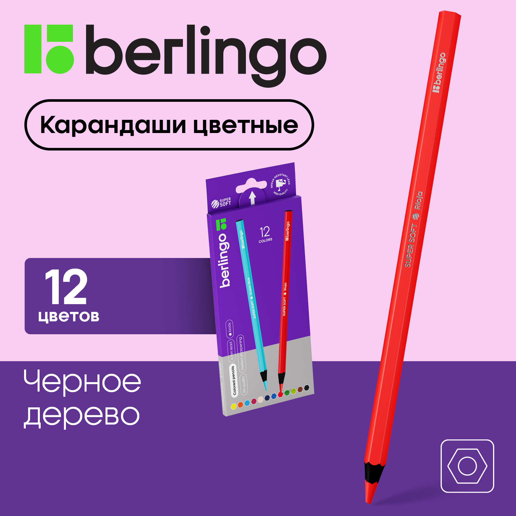 Цветные карандаши для школы 12 цветов, шестигранные / Набор цветных карандашей для рисования школьный Berlingo "SuperSoft. Blackwood" интересное: