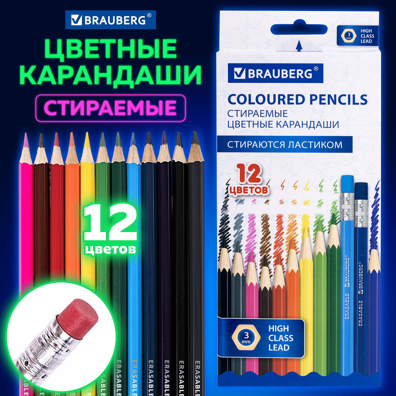 Карандаши цветные стираемые с ластиком BRAUBERG ERASABLE, 12 цветов, мягкий грифель 3 мм, 181932 (181932)