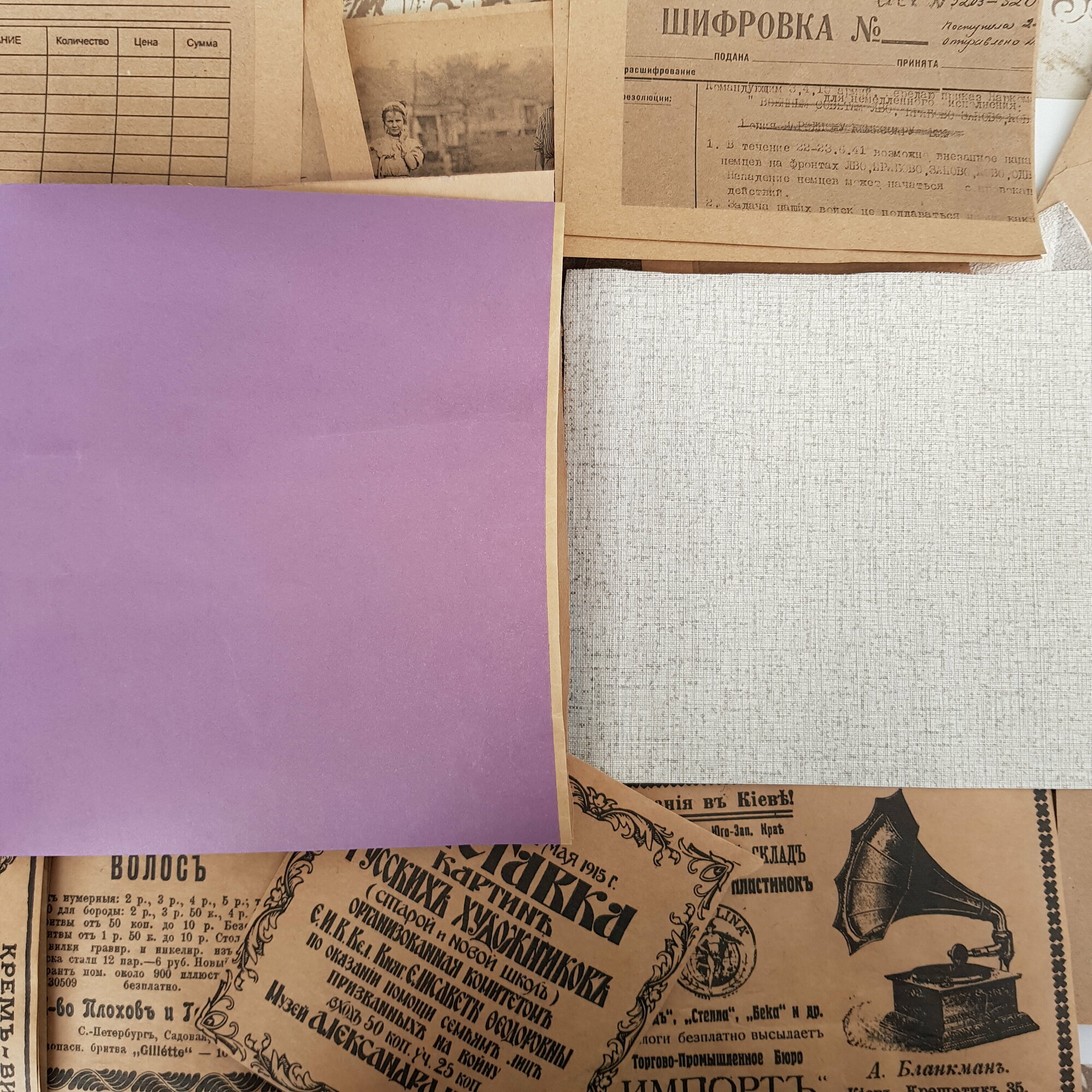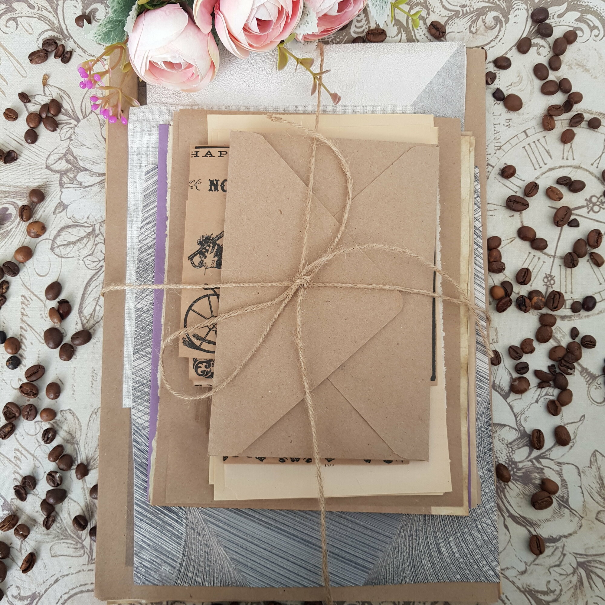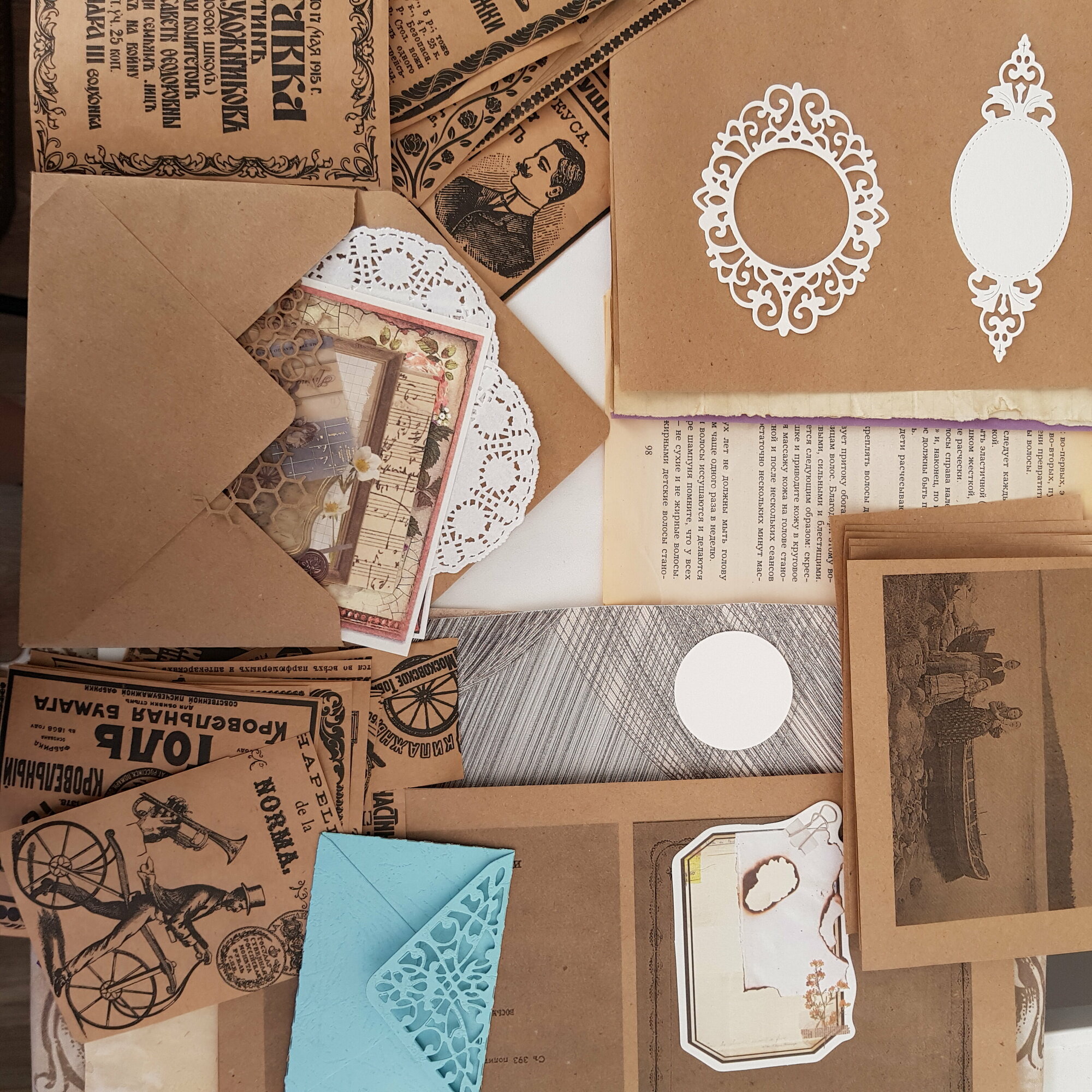 | В набор входит | вырезки из газет 22 шт, распечатки 20 шт, тонированные листы А4 3 шт, тонированные тетрадные листы 2 шт, конверты 2 шт, листы из книги 3 шт, текстурные листы 3 шт, украшения и вырубка 22 шт и пр |