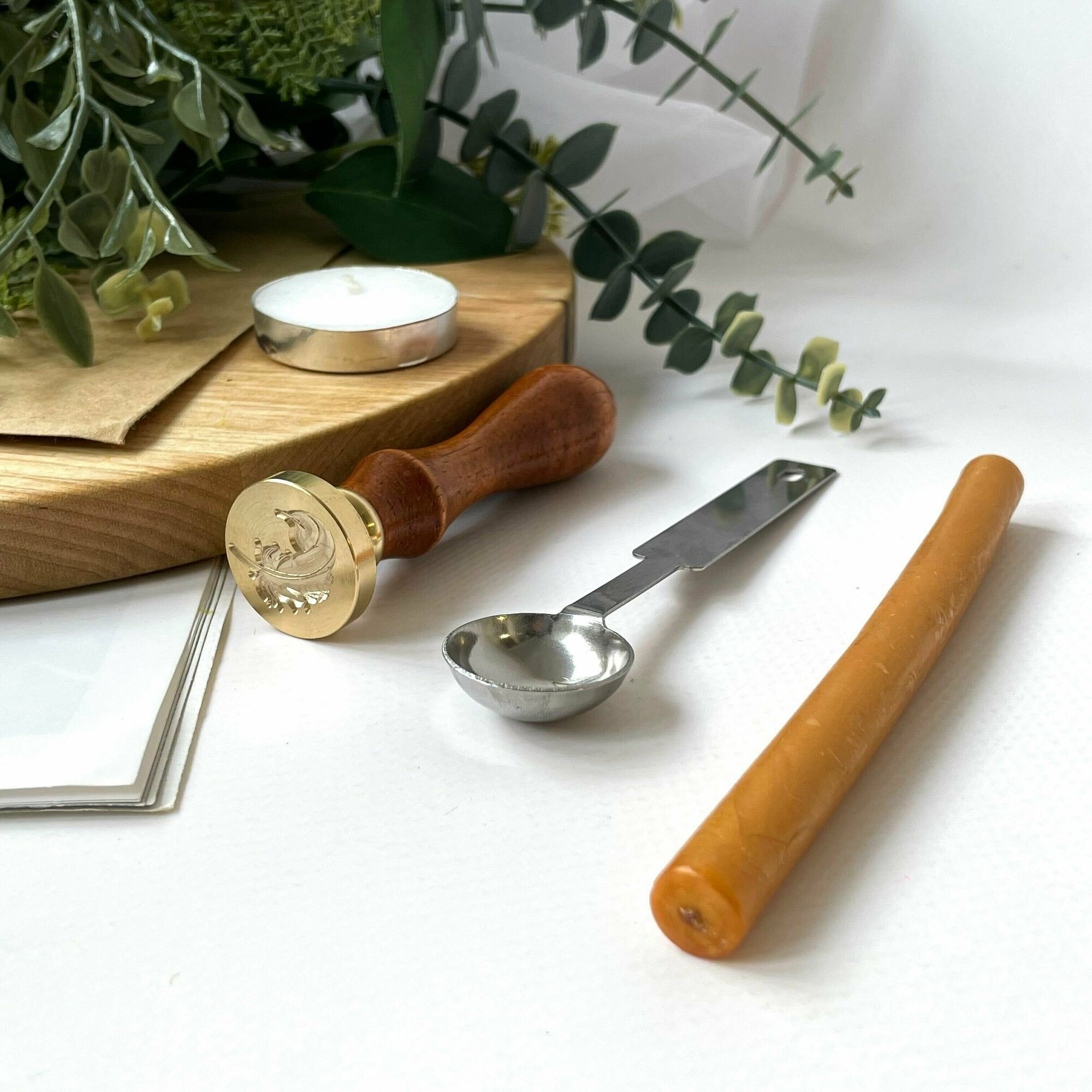 Сургучная печать для декорирования, набор: печать, ложечка, сургуч, свеча. Дизайн Деревце с листьями.
