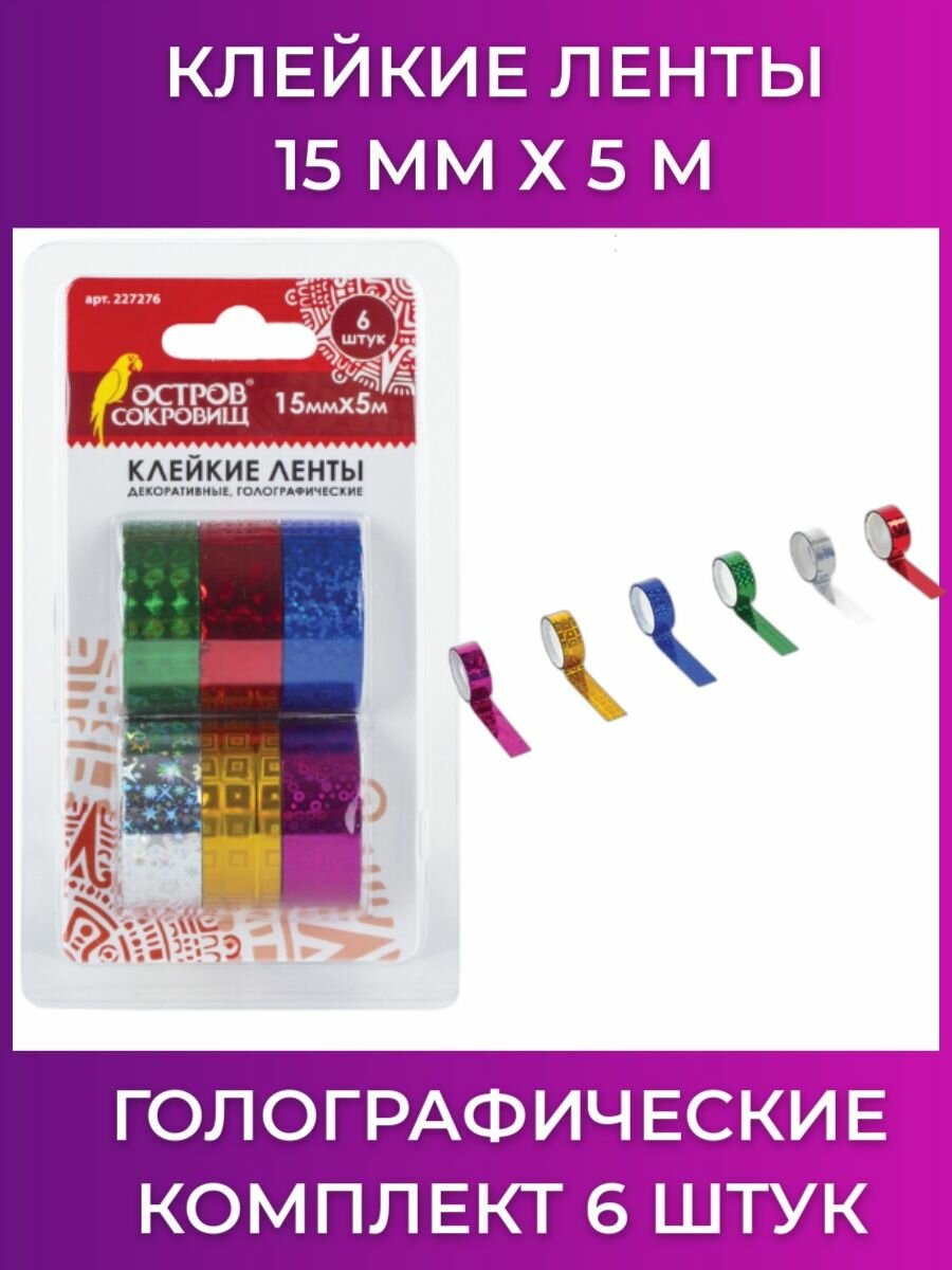 Скотч декоративный для скрапбукинга цветной 15 мм х 5 м, декоративный голографический, Остров Сокровищ, комплект 6 шт., ассорти №2, 227276 интересное: