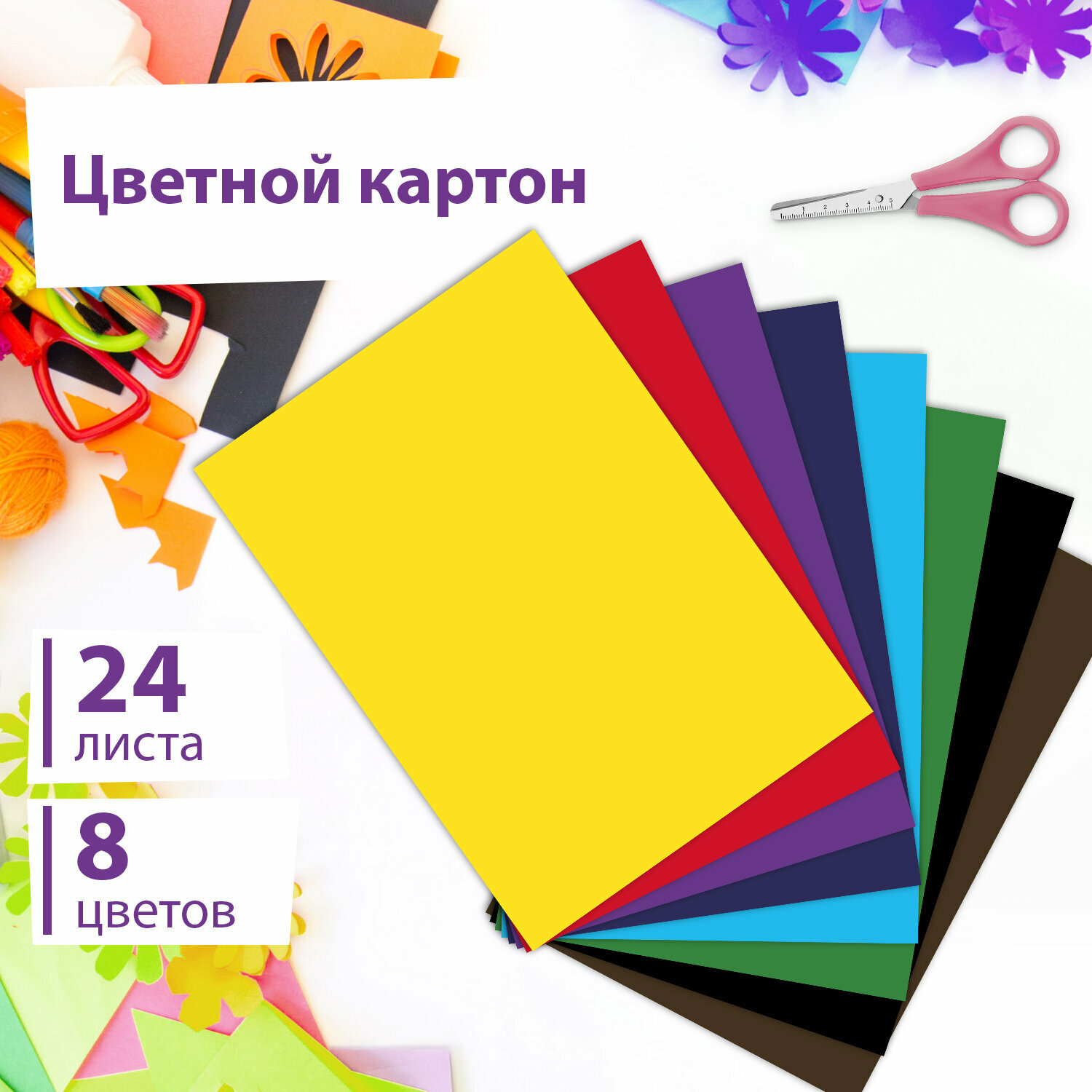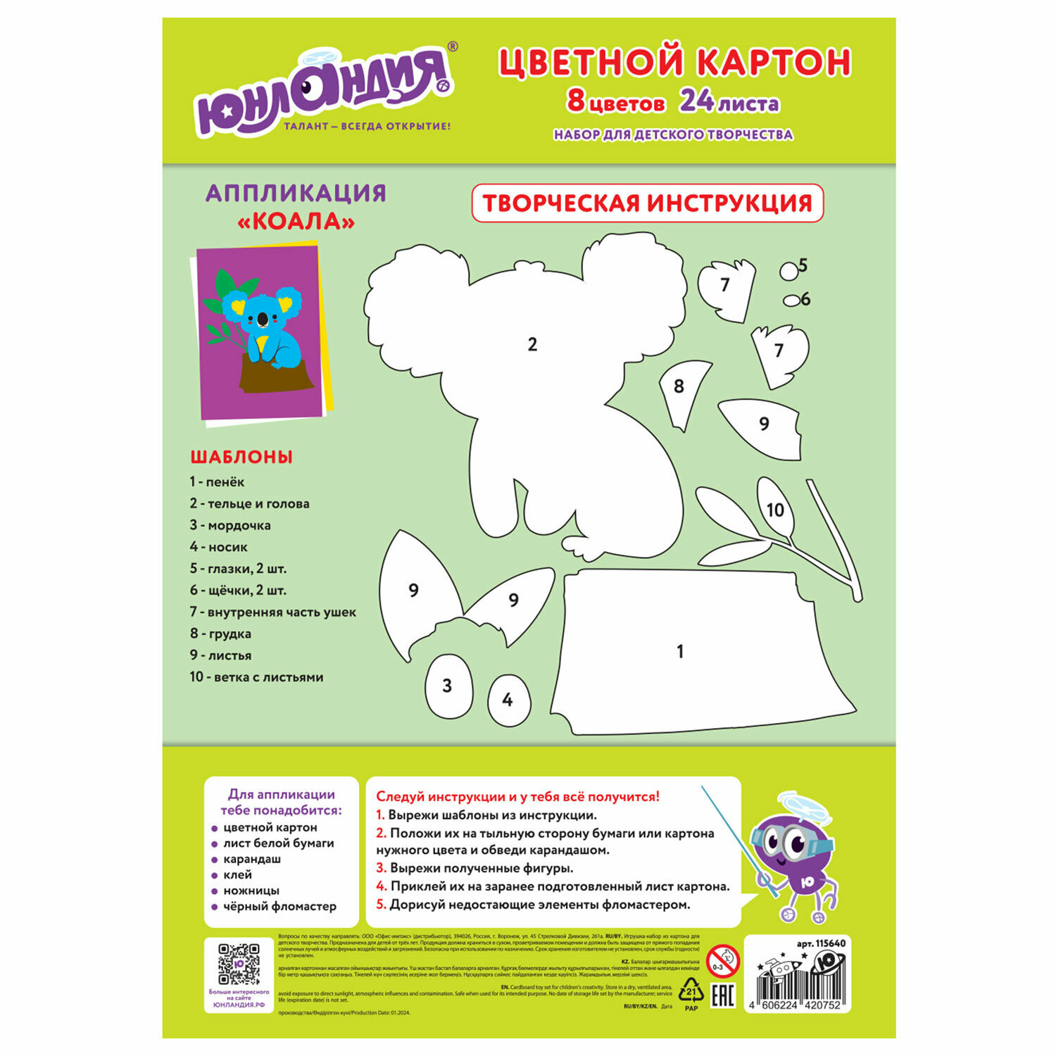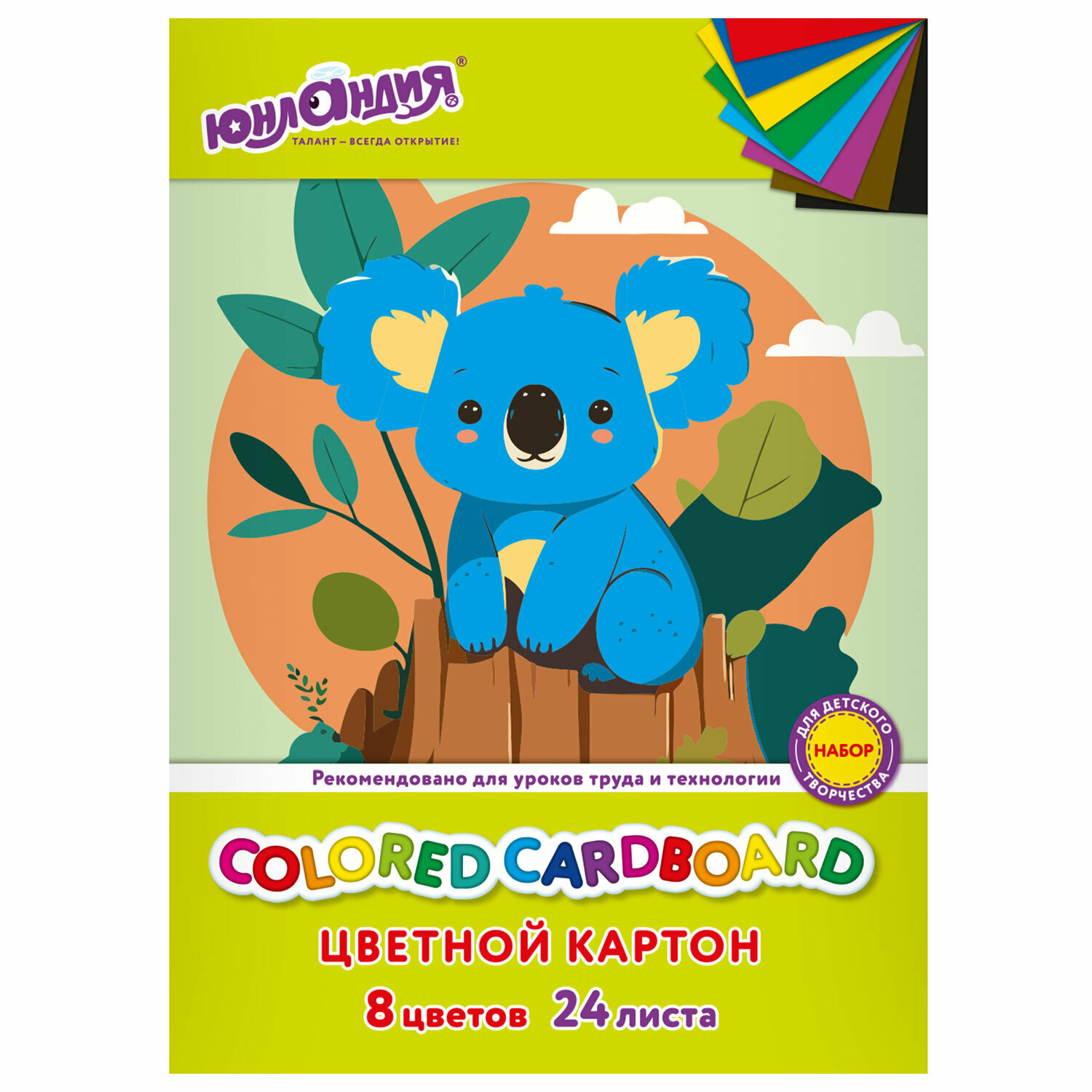 Купить Цветной картон для школы набор А4 матовый, 24 листа 8 цветов, канцелярия для школьников, для творчества, скрапбукинга, Юнландия Коала, 115640