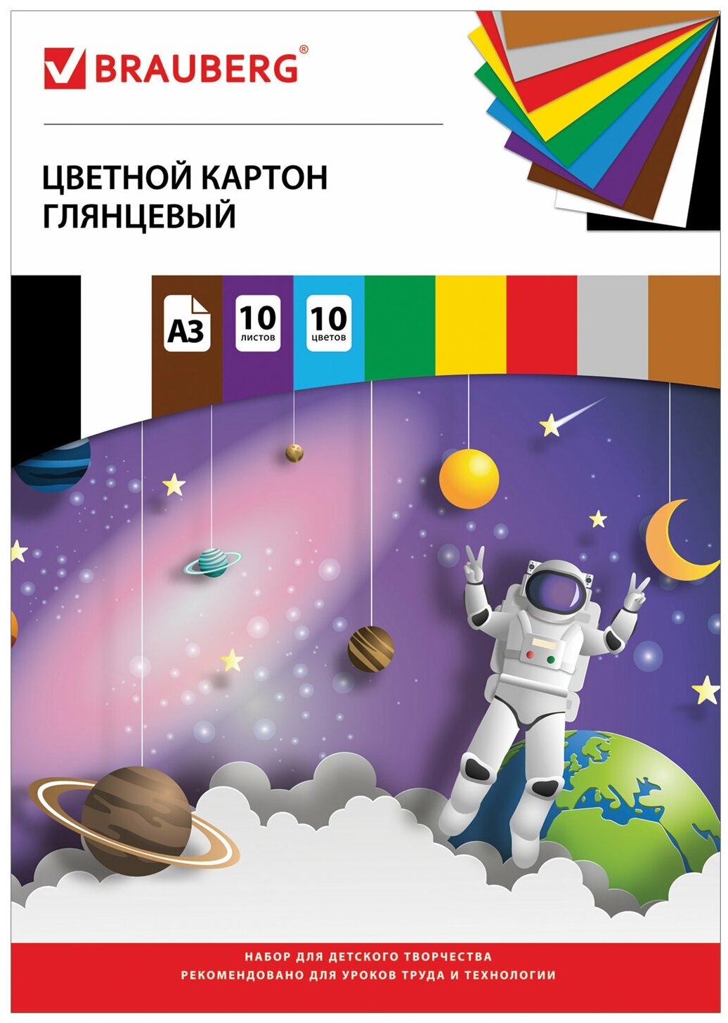 Купить Картон цветной большого формата, А3, мелованный (глянцевый), 10 листов 10 цветов, BRAUBERG, 297х420 мм, "Галактика", 129908