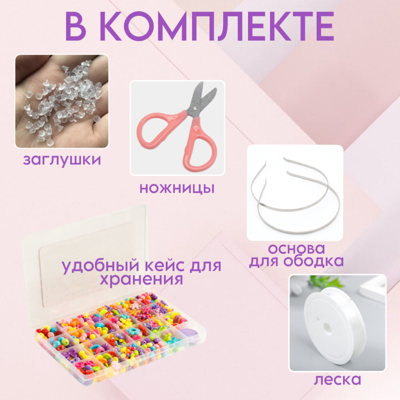 | Комплектация | около 500 бусин; леска; ободок; ножницы |