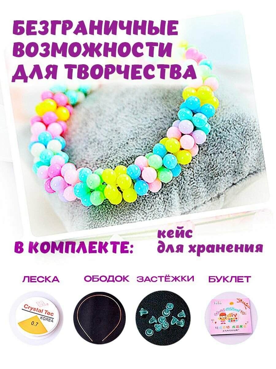 | Комплектация | около 500 бусин; леска; ободок; ножницы |