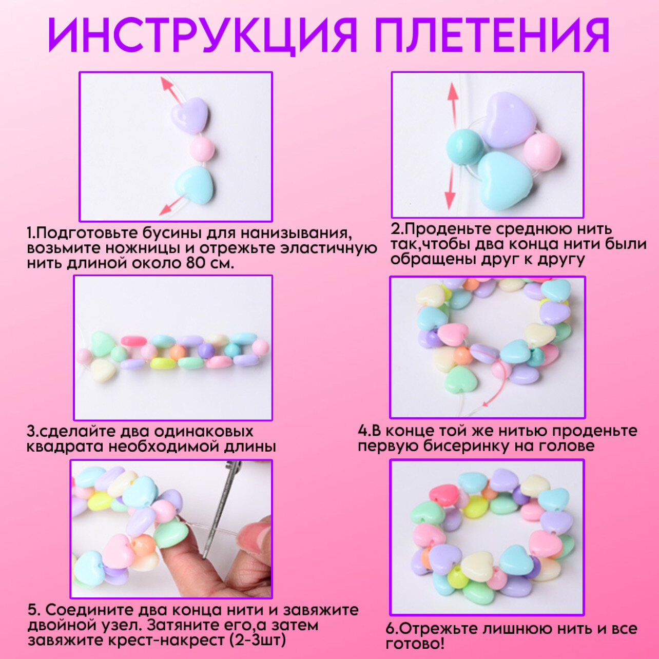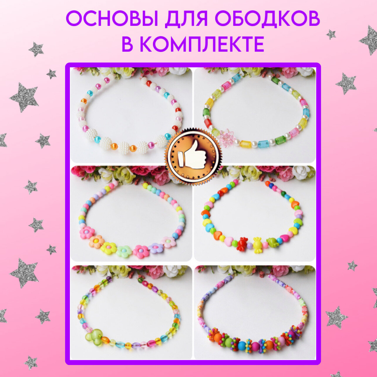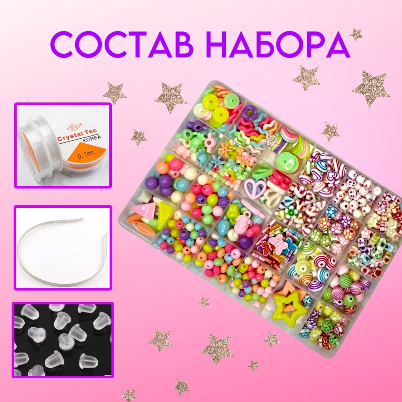 | Комплектация | около 500 бусин; леска; ободок; ножницы |