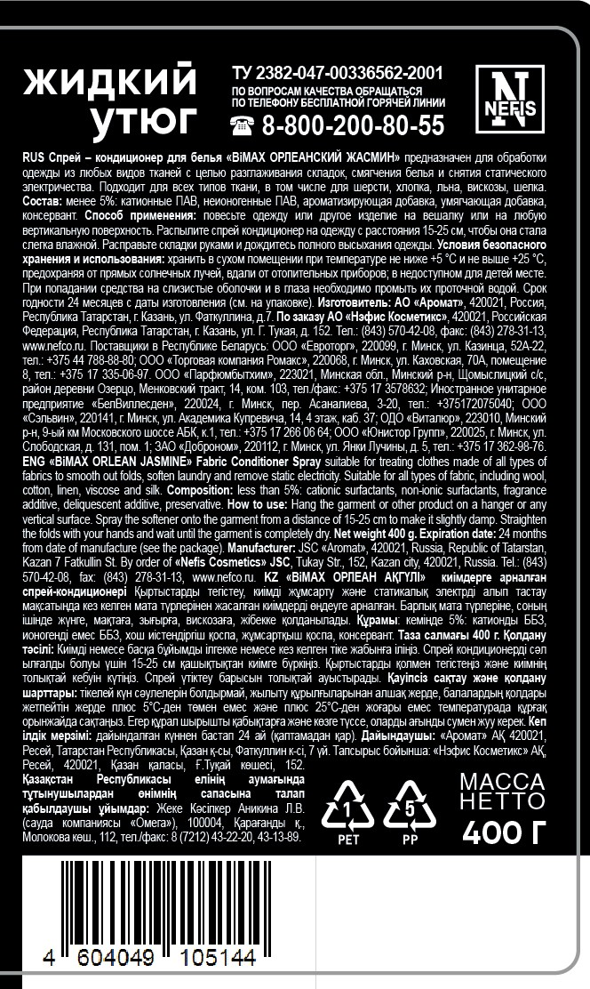 Спрей - кондиционер для белья BiMAX Орлеанский Жасмин, 400 гр интересное: