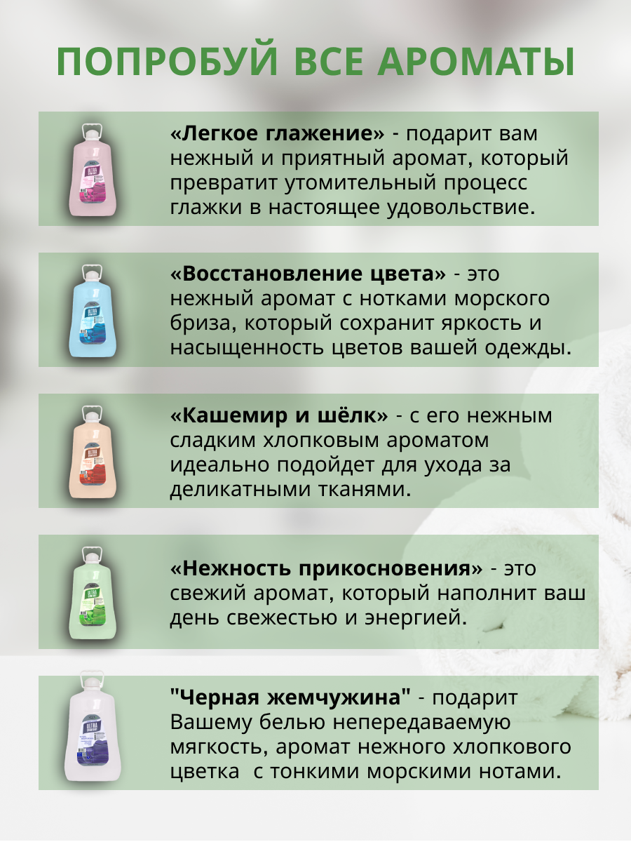 | Эффект | антибактериальный / антистатический / легкая глажка / смягчение ткани / устранение неприятных запахов |