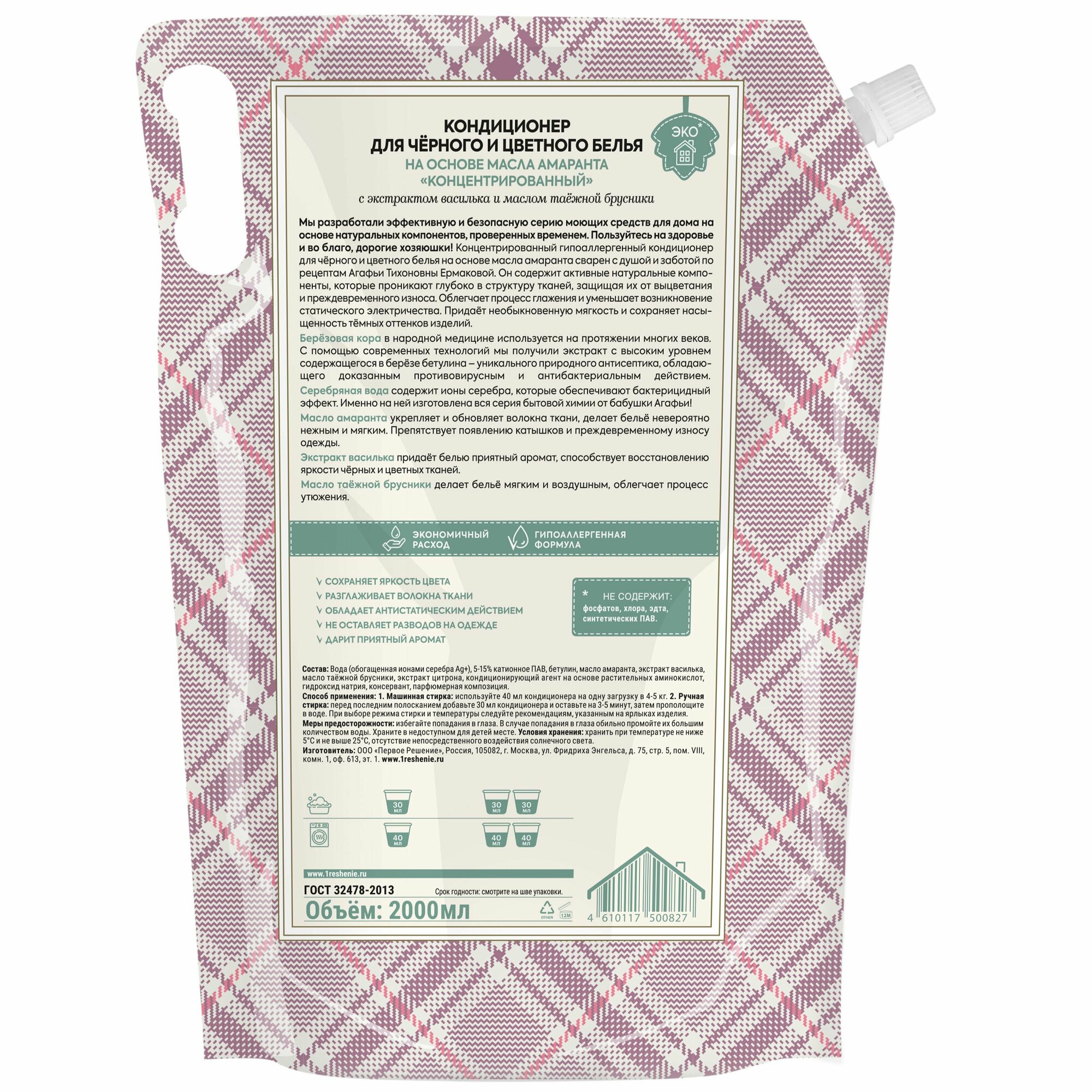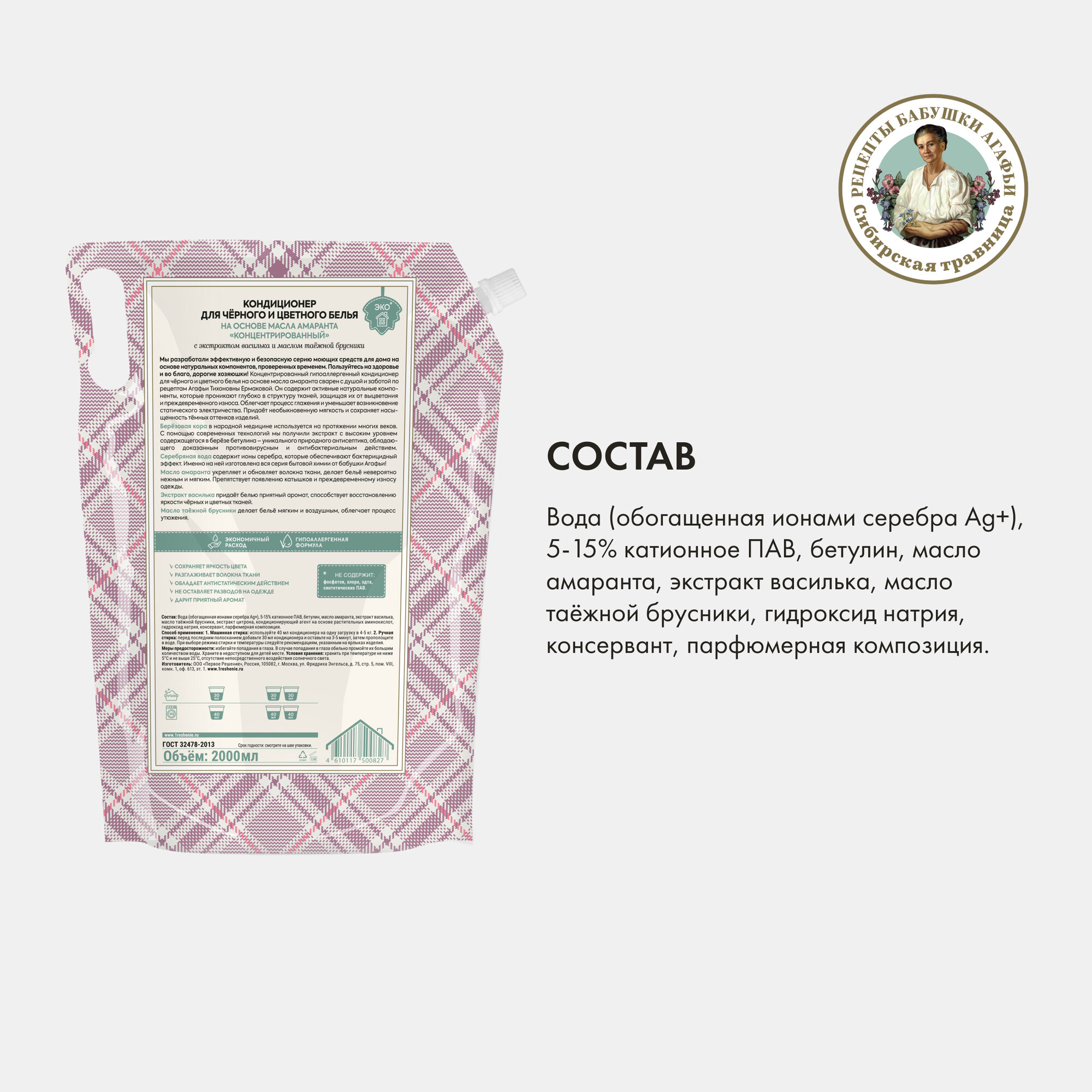 Кондиционер Рецепты бабушки Агафьи Для Хозяюшек для чёрного и цветного на основе омыленного масла амаранта Концентрированный, 2000 мл интересное: